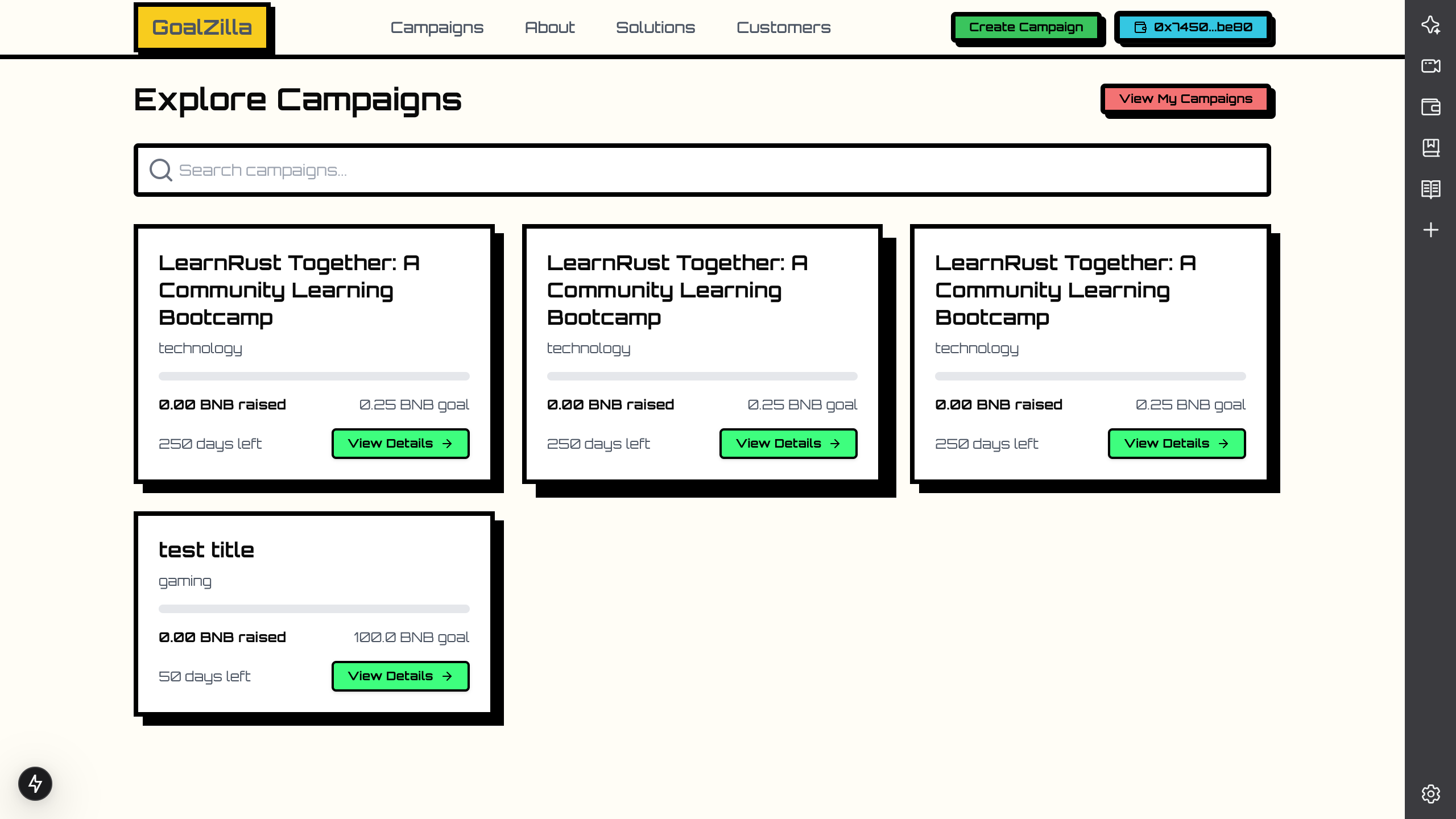 GoalZilla is a decentralized crowdfunding platform built on the BNB Chain Testnet, designed to eliminate risk and build trust. It introduces a new model where funding is tied directly to progress through milestone-based releases, peer-powered reviews, and an innovative ad-based donation system.