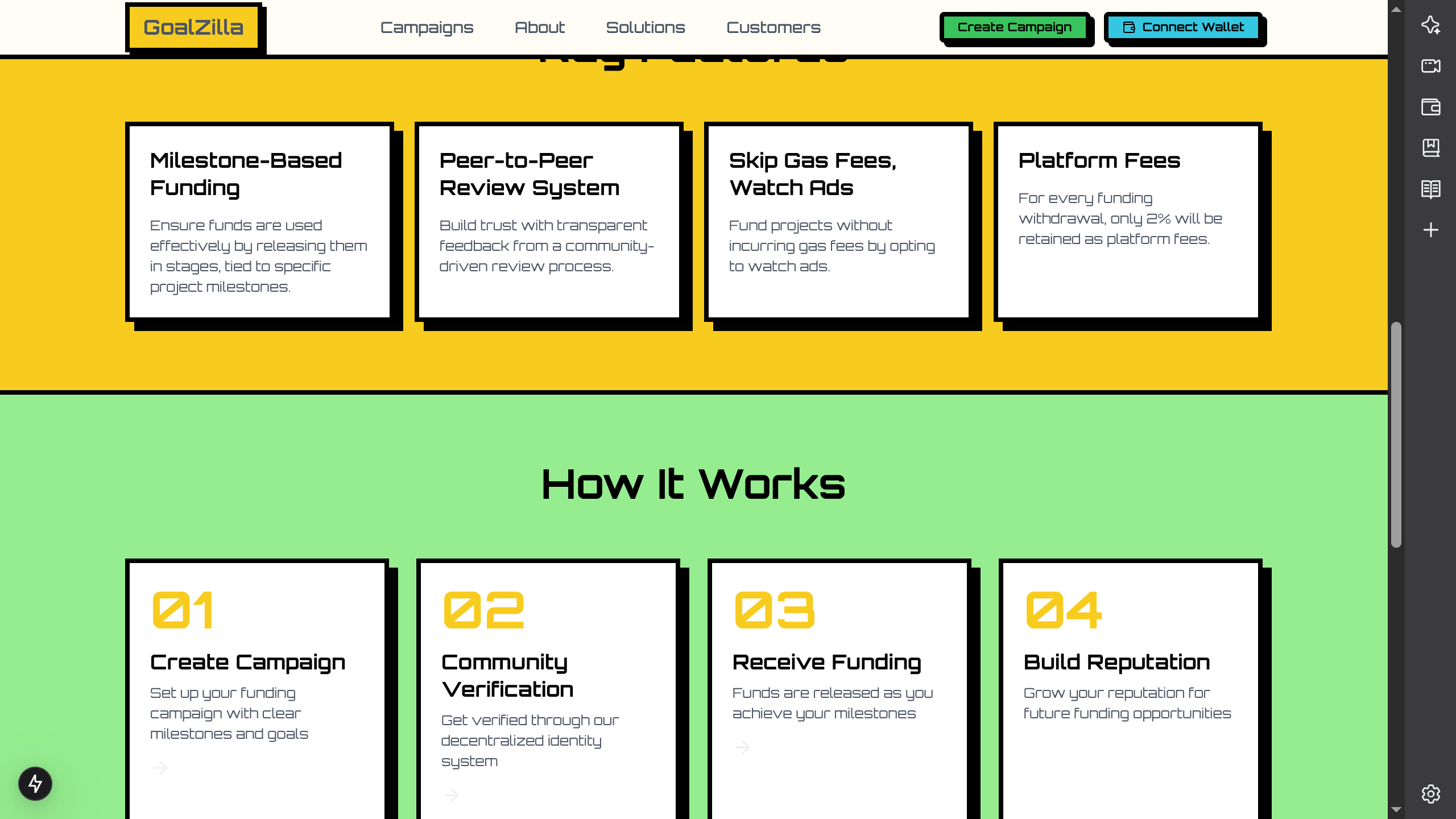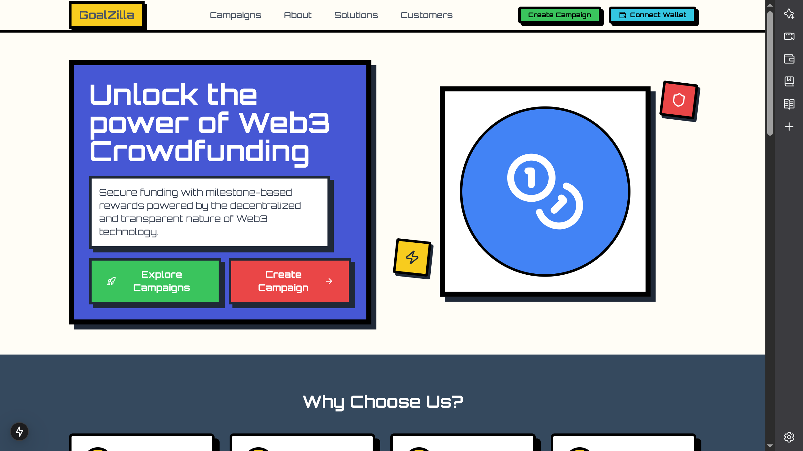 The traditional crowdfunding space is plagued by rug-pulls and a lack of accountability, where backers fund a promise with no guarantee of results. GoalZilla solves this fundamental trust problem by ensuring funds are only released when creators deliver on their promises, with verification provided by the backers themselves.