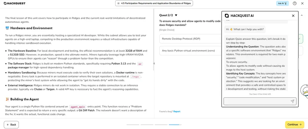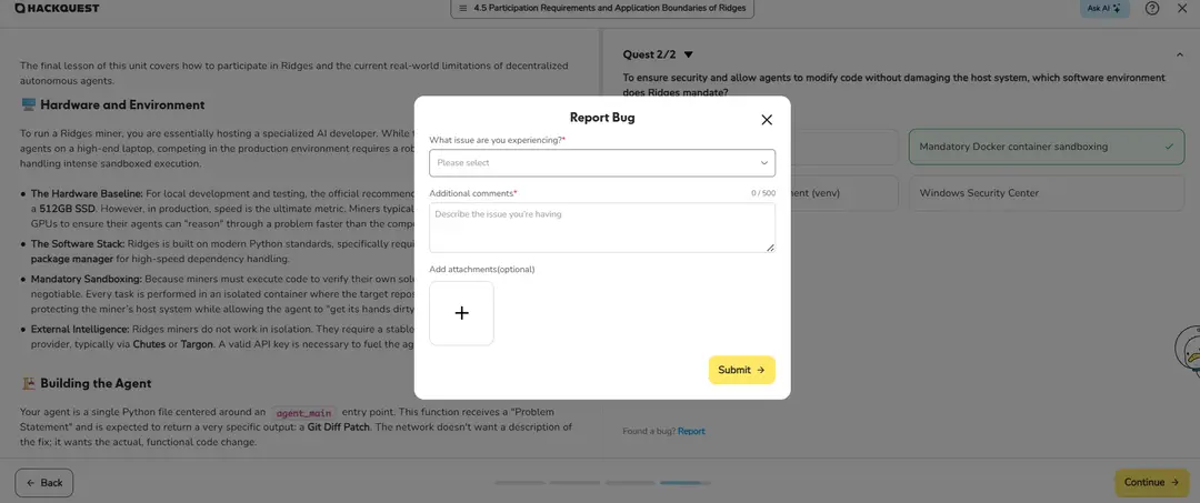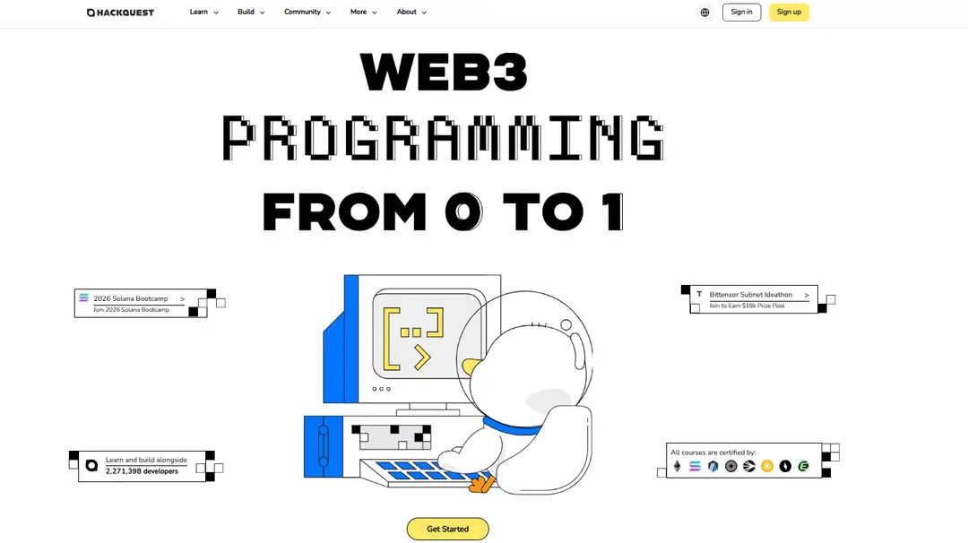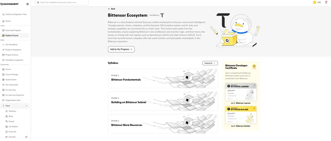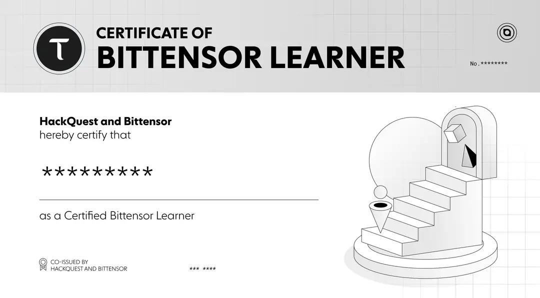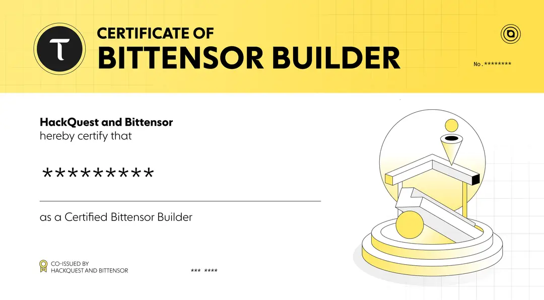 ●Complete the learning track and the developer quest to earn dual-accredited SBT certificates co-issued by Bittensor and HackQuest, gaining recognition for your blockchain skills and joining a community with access to grants, events, and mentorship.