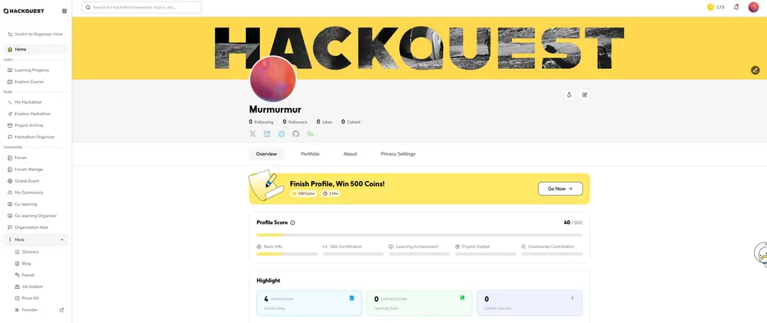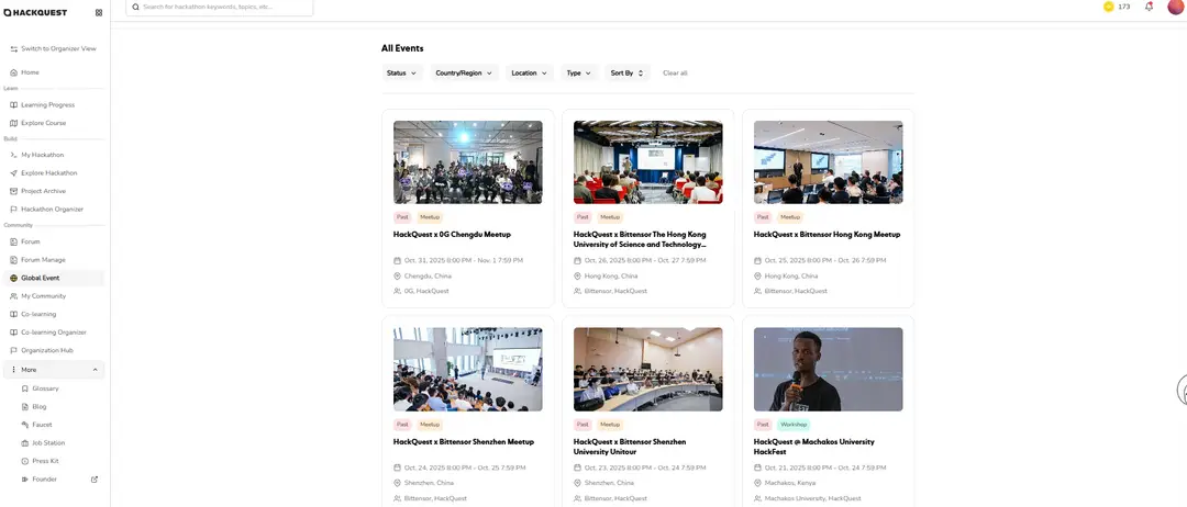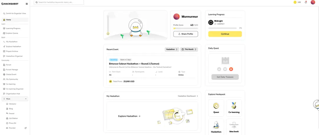 ●Join Upcoming Hackathons: Head to the “Build” tab and tap on “Explore Hackathon” to discover events featured on the HackQuest Hackathon page.