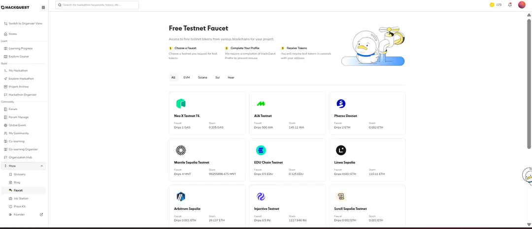 ●Access free testnet tokens for developing and testing blockchain projects across multiple networks.