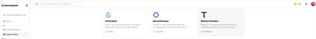 ●Navigate to the “Learn” tab, click “Explore Course”.Click on the “Bittensor Developer” Button and "Add To My Progress" to start your Learning Track.