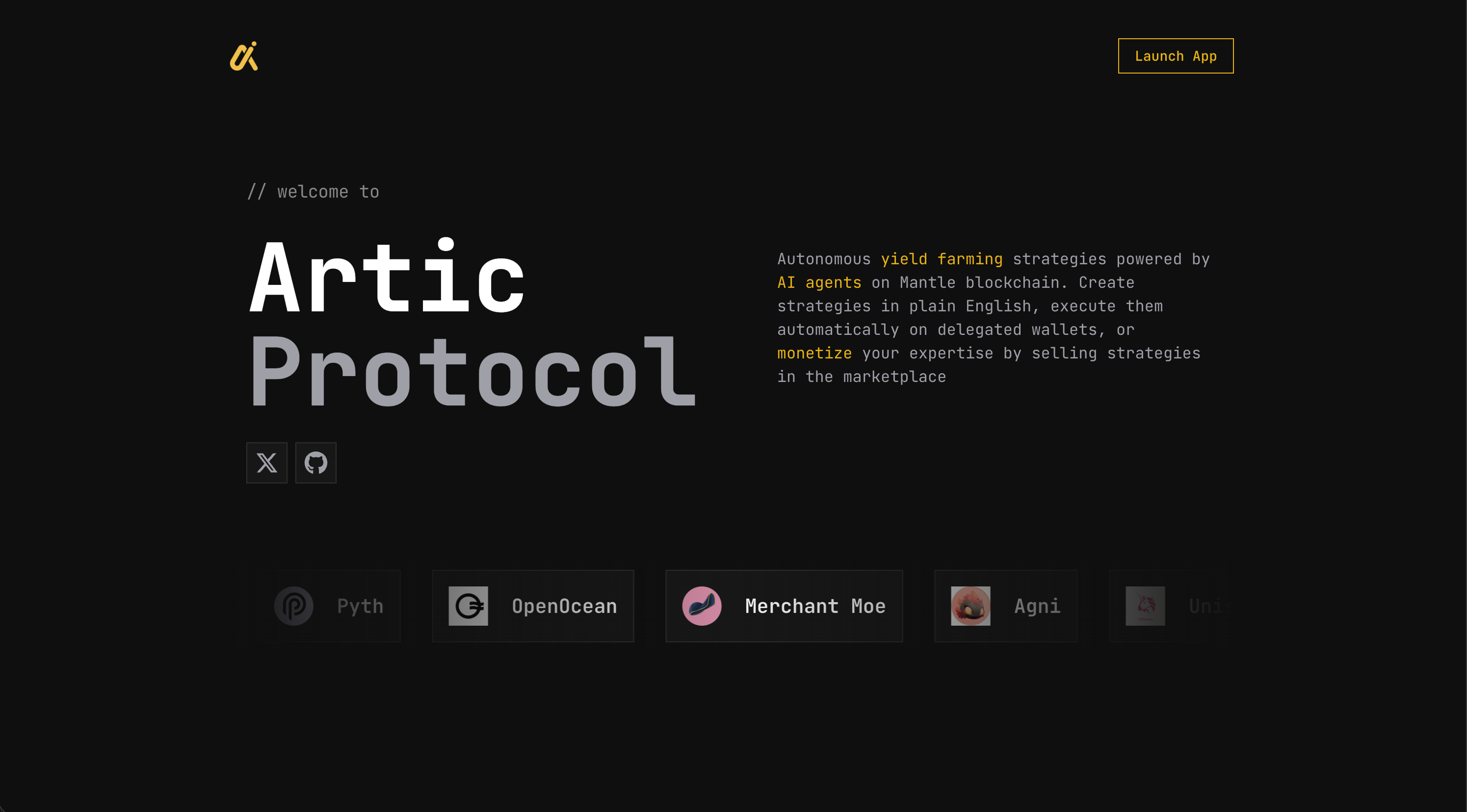 Artic Protocol empowers traders to create, share, and execute trading strategies autonomously through AI agents on the Mantle blockchain. Users define strategies in plain English, and the intelligent agent layer interprets and executes them on-chain—eliminating the need for manual intervention or complex scripting.