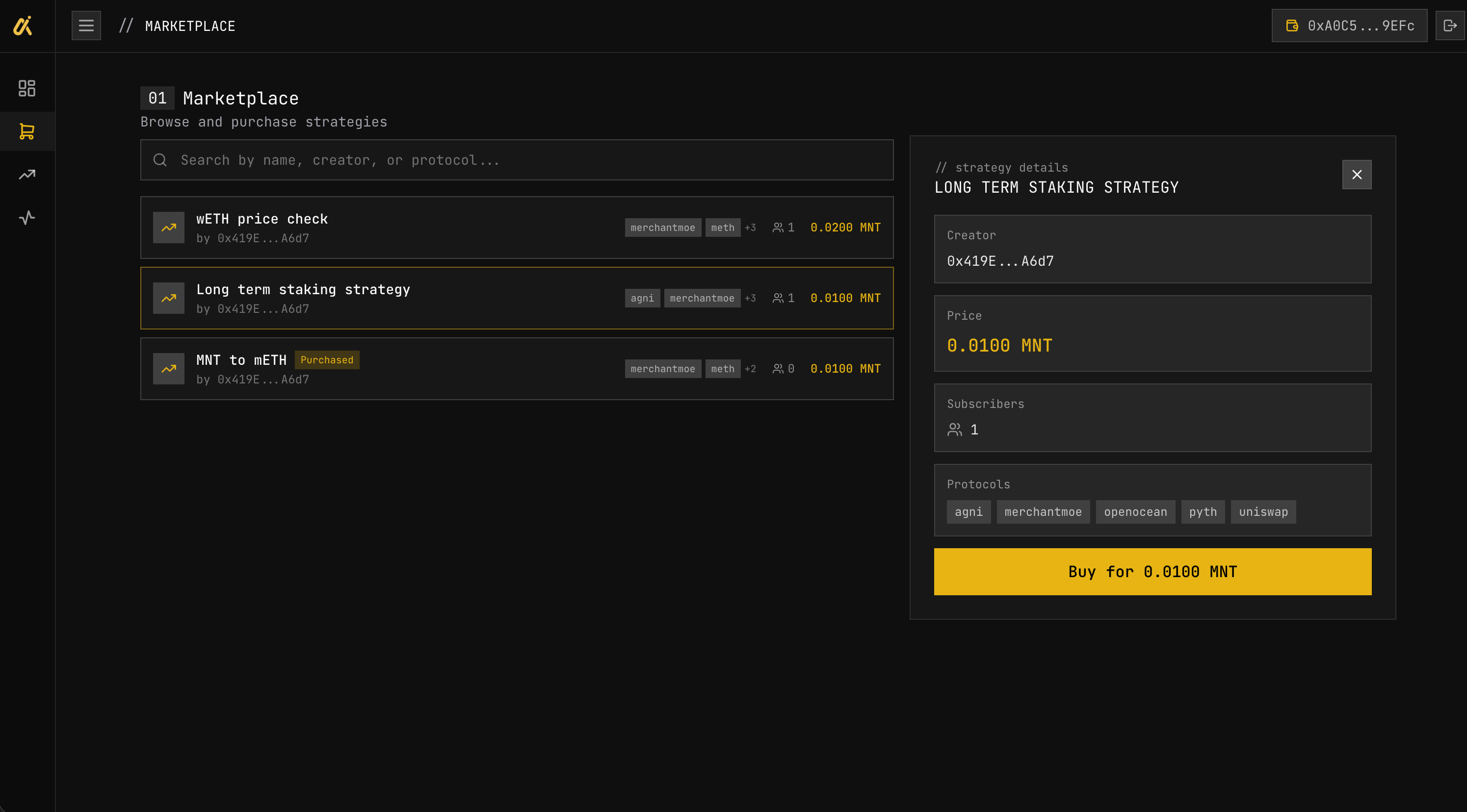 List, buy, and sell trading strategies with transparent economics—95% of earnings go directly to creators, with a 5% protocol fee.