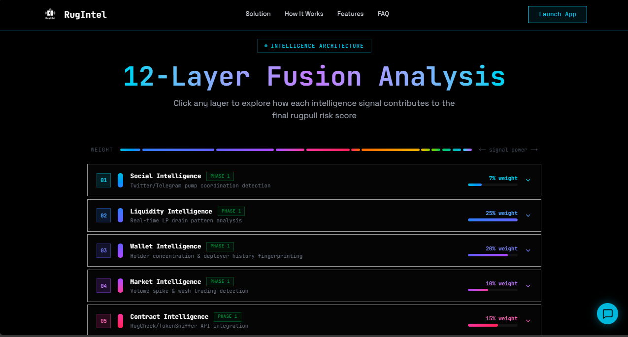 Layer 3: Wallet Intelligence — Analyzes holder concentration and deployer history. Flags tokens where top holder controls >50% supply or dev wallet sells >20% holdings within 5 minutes. Includes fund flow tracing to detect sock puppet wallets.