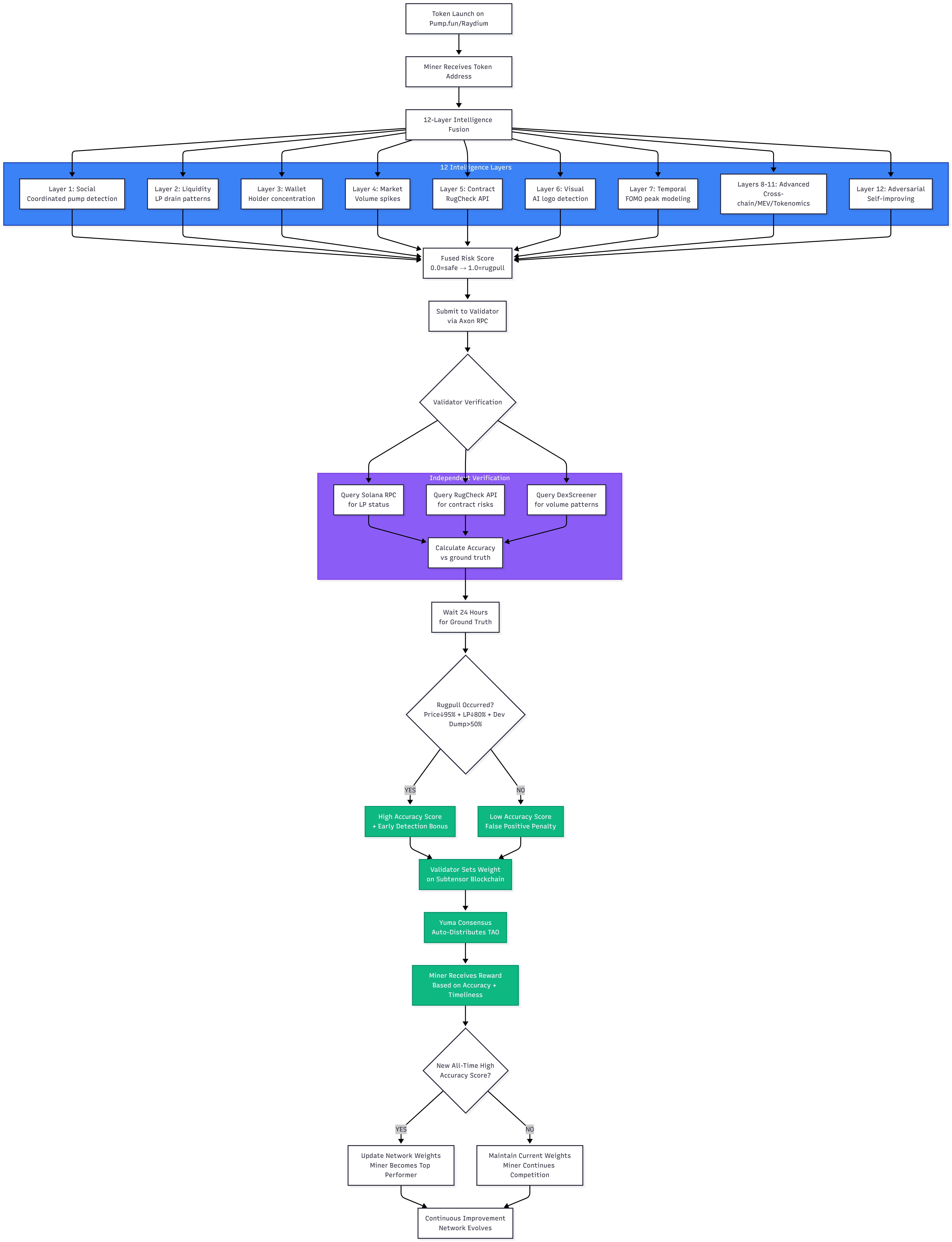 Miners compete to produce accurate risk assessments using a proprietary 12-Layer Signal Fusion architecture. Validators independently verify predictions against 24-hour on-chain ground truth outcomes and assign weights proportional to accuracy. Through Yuma Consensus, TAO emissions are automatically distributed to the most accurate intelligence producers.