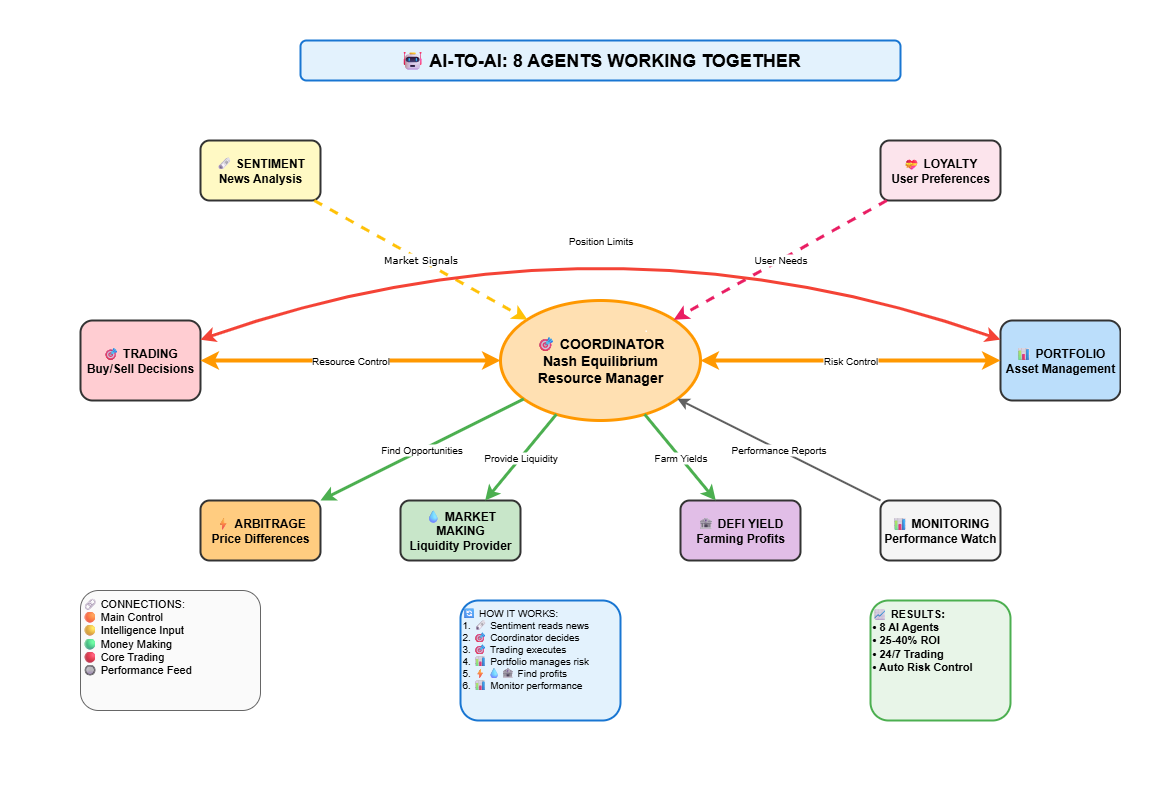 Sự phối hợp giữa các Agent được điều khiển bởi nguyên lý Cân bằng Nash, tạo ra một hệ thống giao dịch thông minh, linh hoạt và có khả năng phòng thủ tốt hơn nhiều so với một thuật toán đơn lẻ.