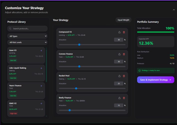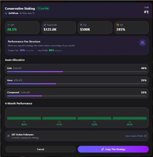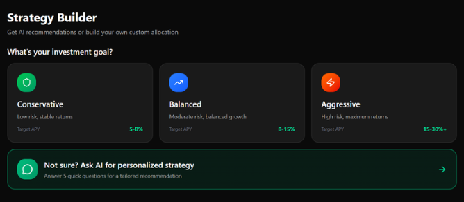 Each strategy comes with a target performance range and risk profile, allowing users to choose based on their goals.