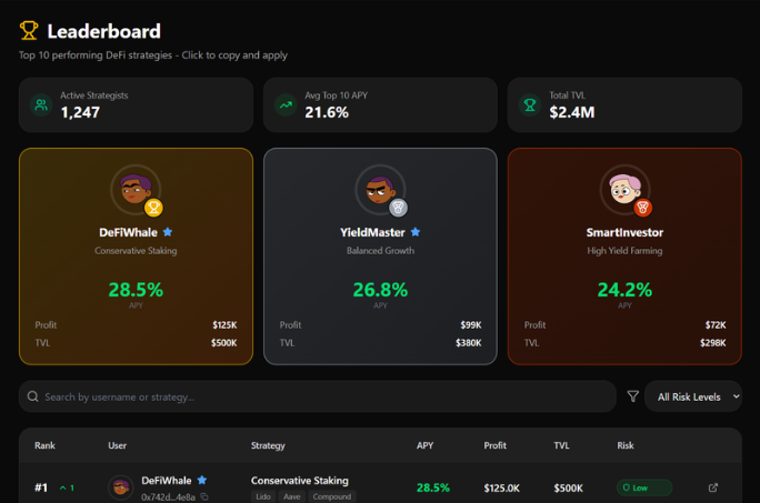 A leaderboard highlights top-performing strategies