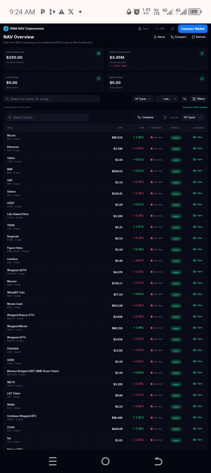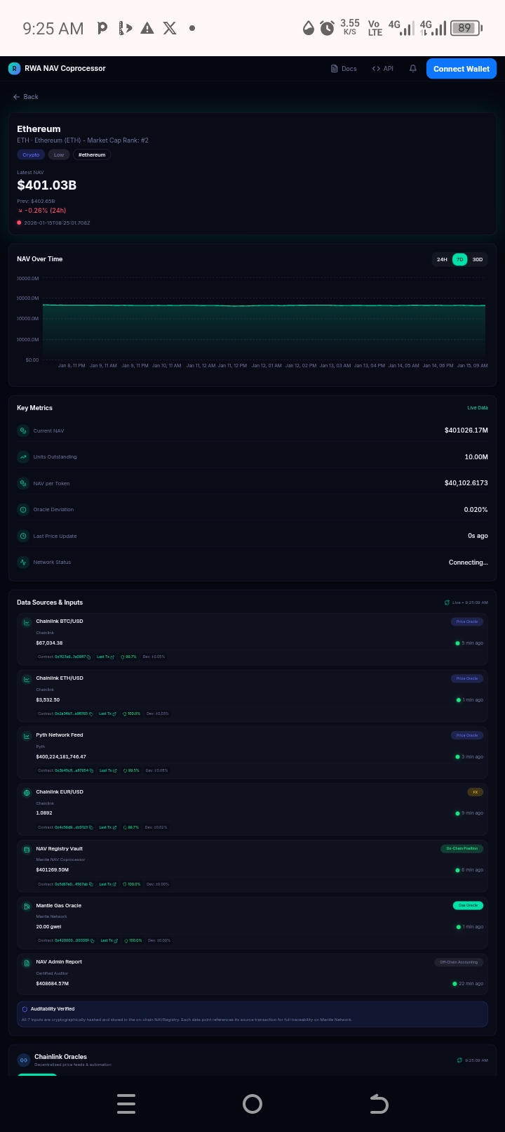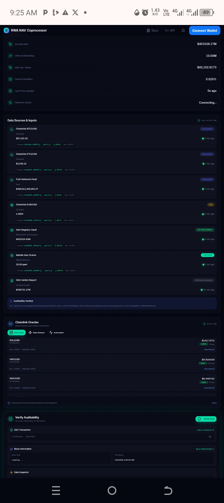 The Mantle NAV Coprocessor is an AI-powered transparency layer for Real World Assets (RWA) on the Mantle network. It automatically calculates and publishes the Net Asset Value (NAV) of RWA pools, making their valuation transparent, verifiable, and easily consumable by developers and investors.