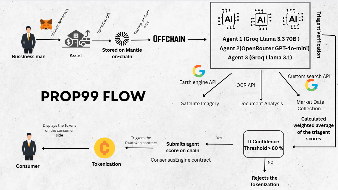 Prop99 is a rollup-native RWA protocol on Mantle L2 that uses Tri-agent oracles to verify and value real-world assets, anchor verification to Ethereum, and tokenize assets.