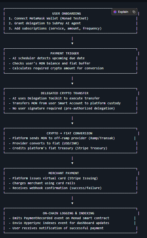 Users delegate payment permissions to the SubPay AI agent, which monitors due dates and automatically converts crypto to fiat for payment execution—no manual signing required for recurring charges.