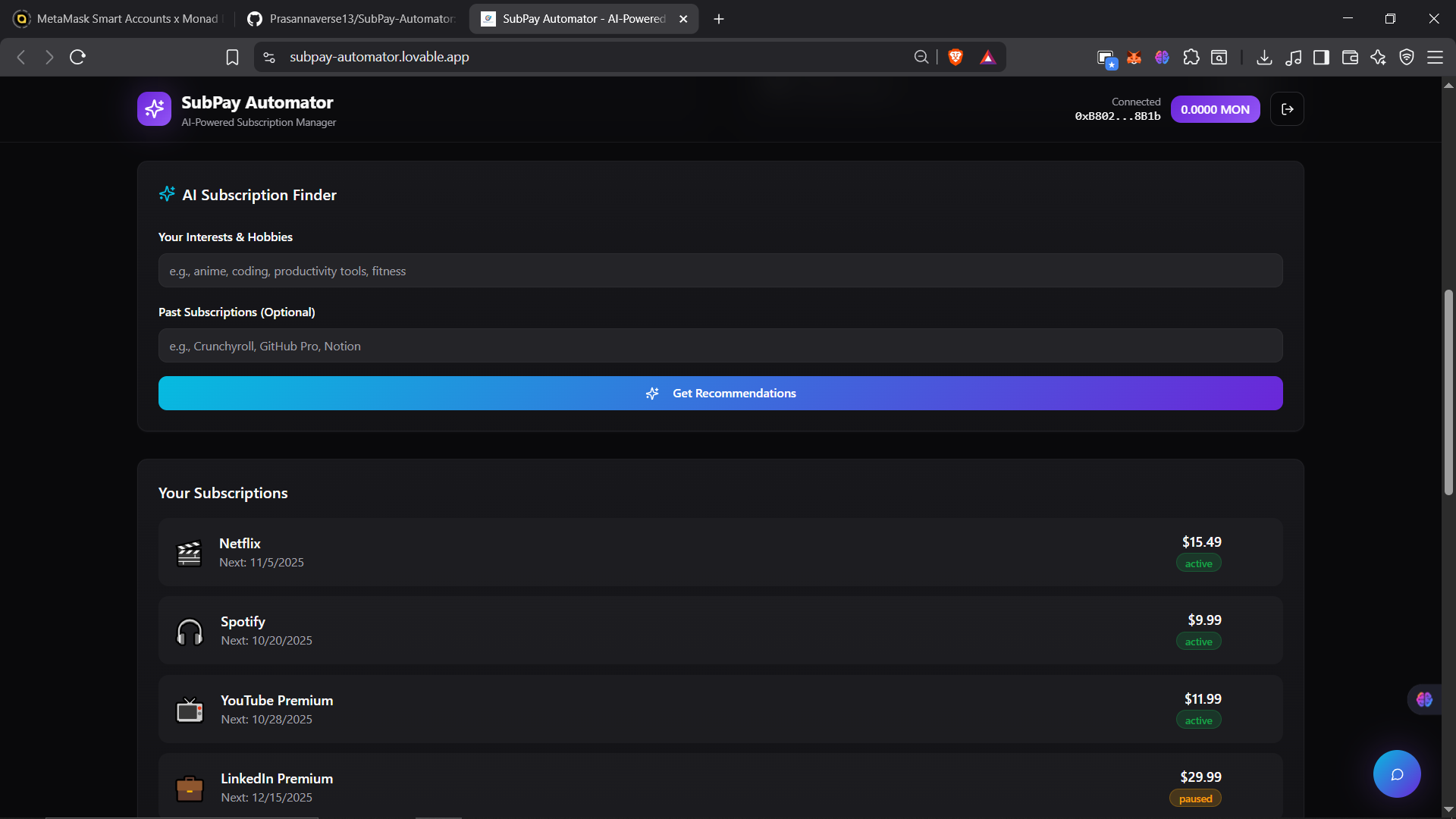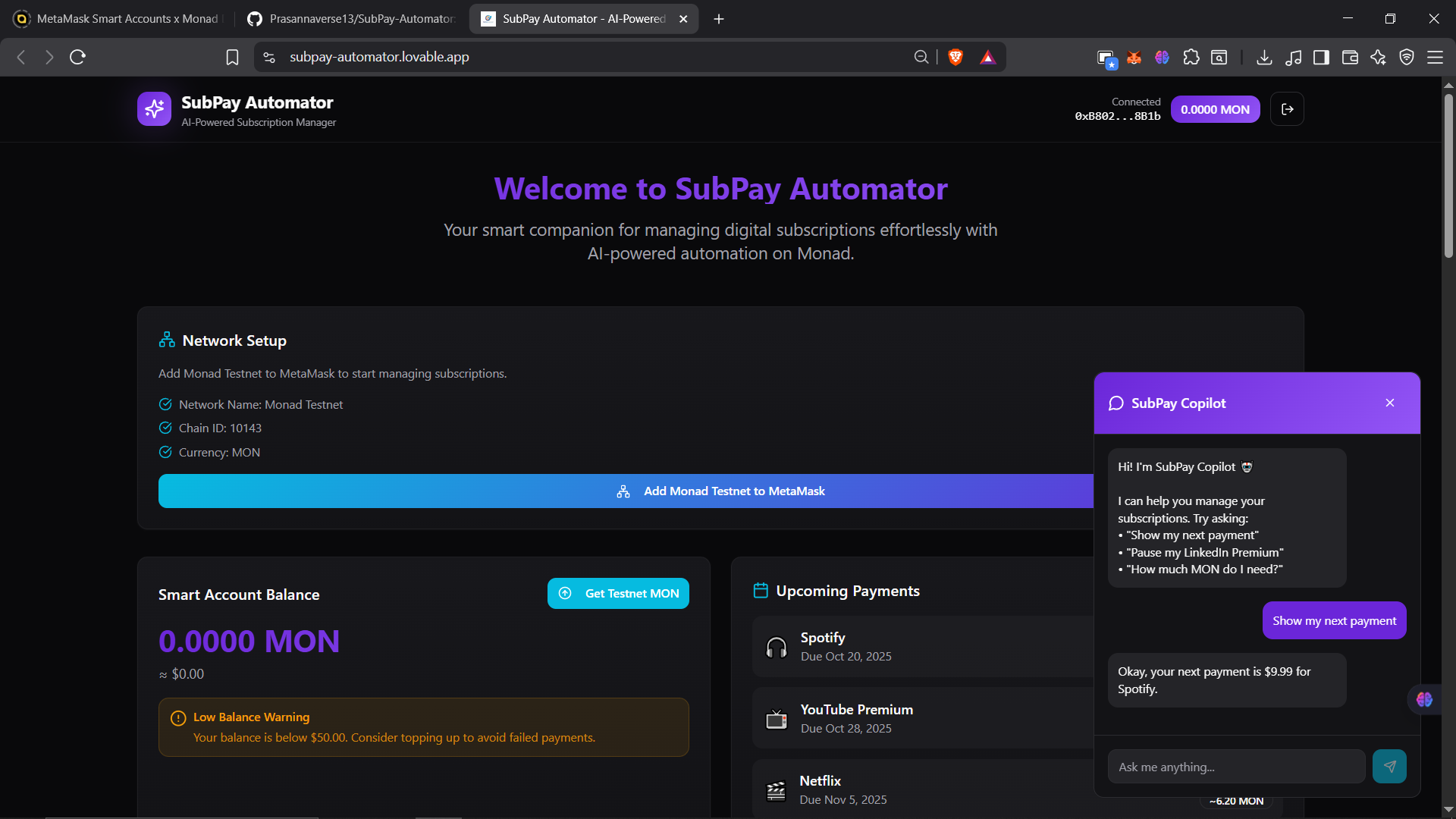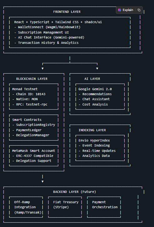 SubPay Automator is a decentralized subscription management platform that combines AI intelligence with blockchain technology to automate recurring payments. Built for the Monad Hackathon, it leverages MetaMask Smart Accounts, Delegation Toolkit, Envio indexing, and Gemini AI to provide a seamless Web3 subscription experience.