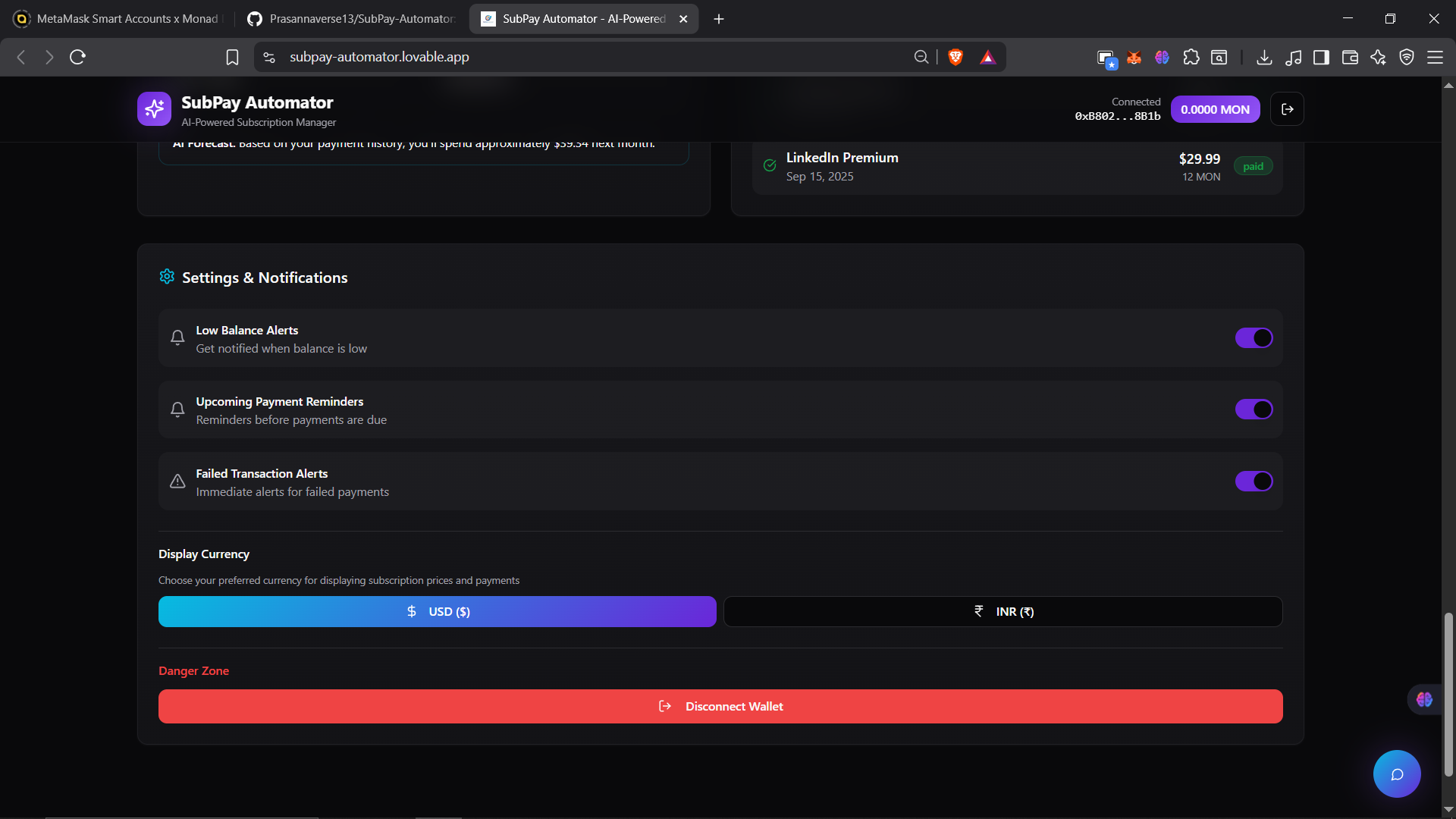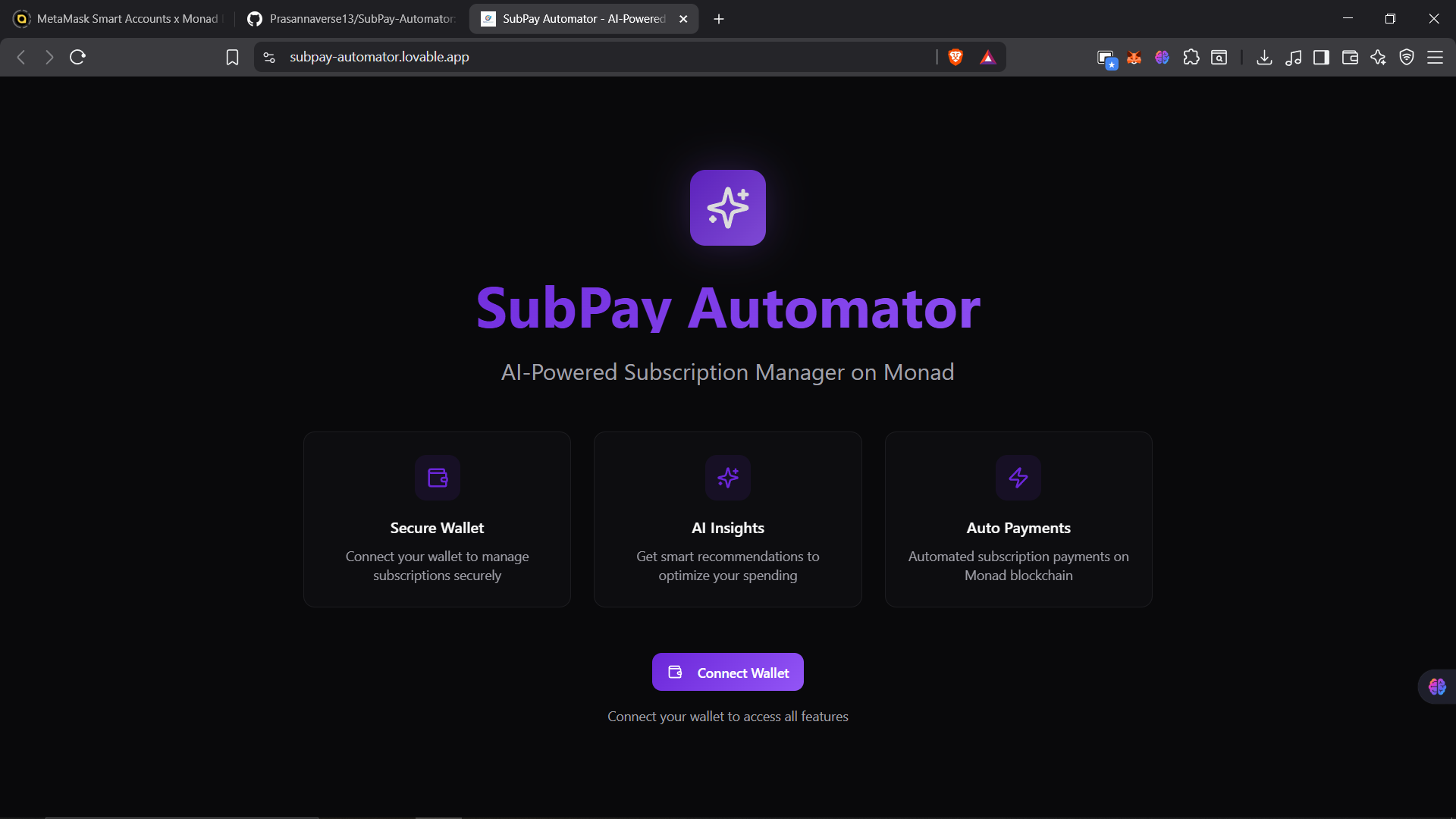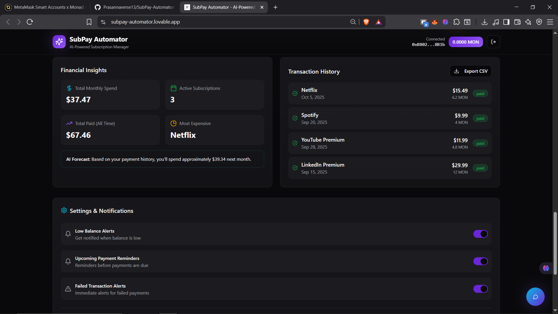 SubPay Automator is a decentralized subscription management platform that combines AI intelligence with blockchain technology to automate recurring payments. Built for the Monad Hackathon, it leverages MetaMask Smart Accounts, Delegation Toolkit, Envio indexing, and Gemini AI to provide a seamless Web3 subscription experience.