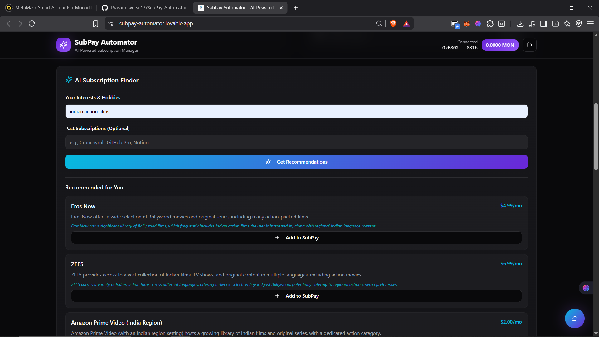 AI-Powered Web3 Subscription Management on Monad Testnet