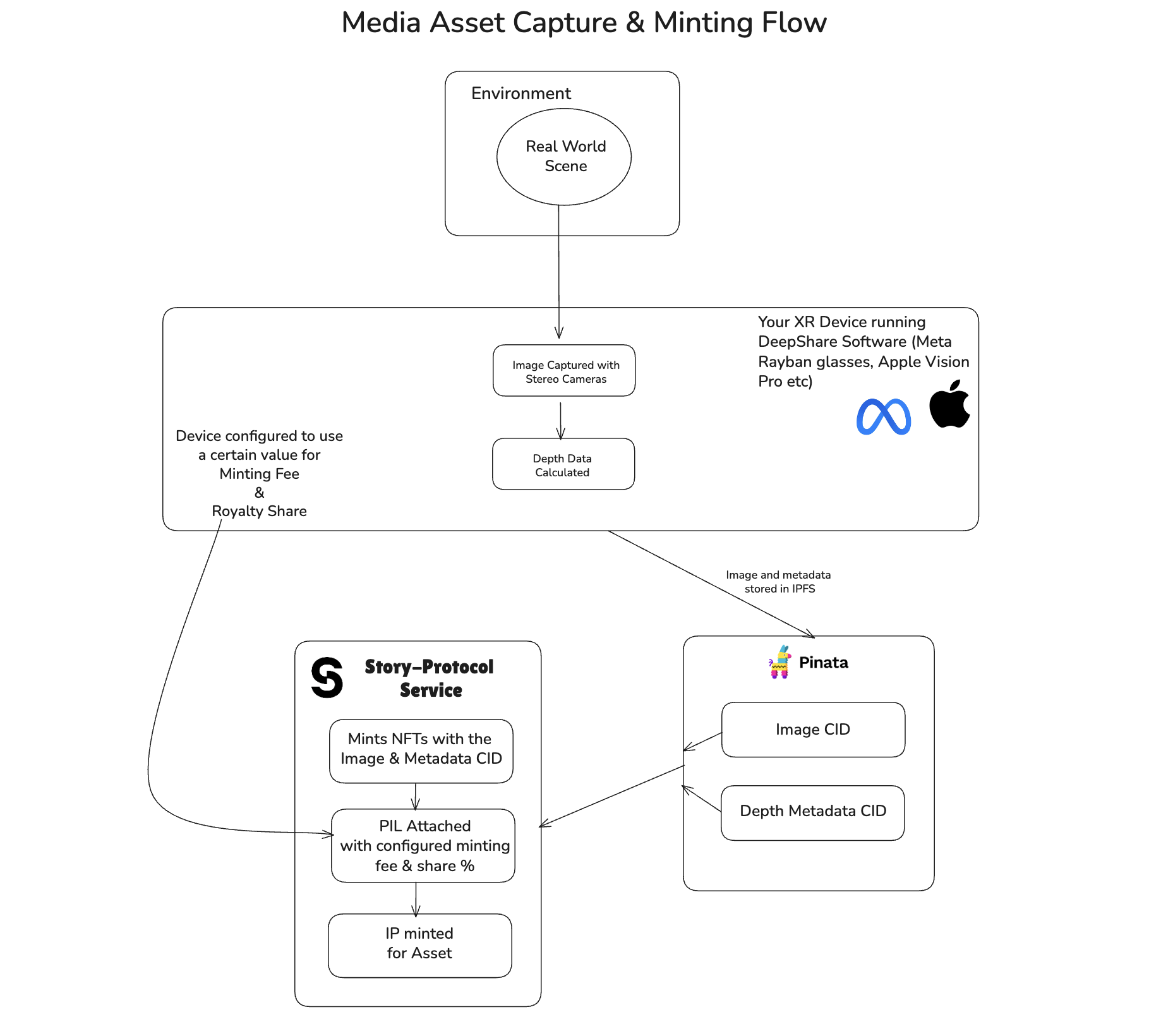We have developed specialized software that can run on wearables and other portable devices such as smart glasses and mobile phones with dual camera systems or devices equipped with LIDAR sensors. This software captures images along with their corresponding depth metadata and directly mints intellectual property rights using Story Protocol for both the image and its depth data.