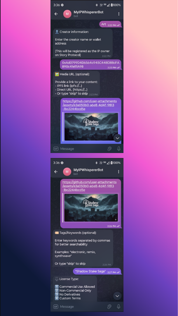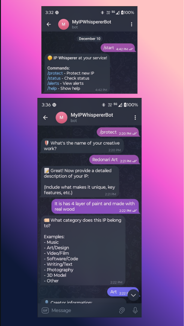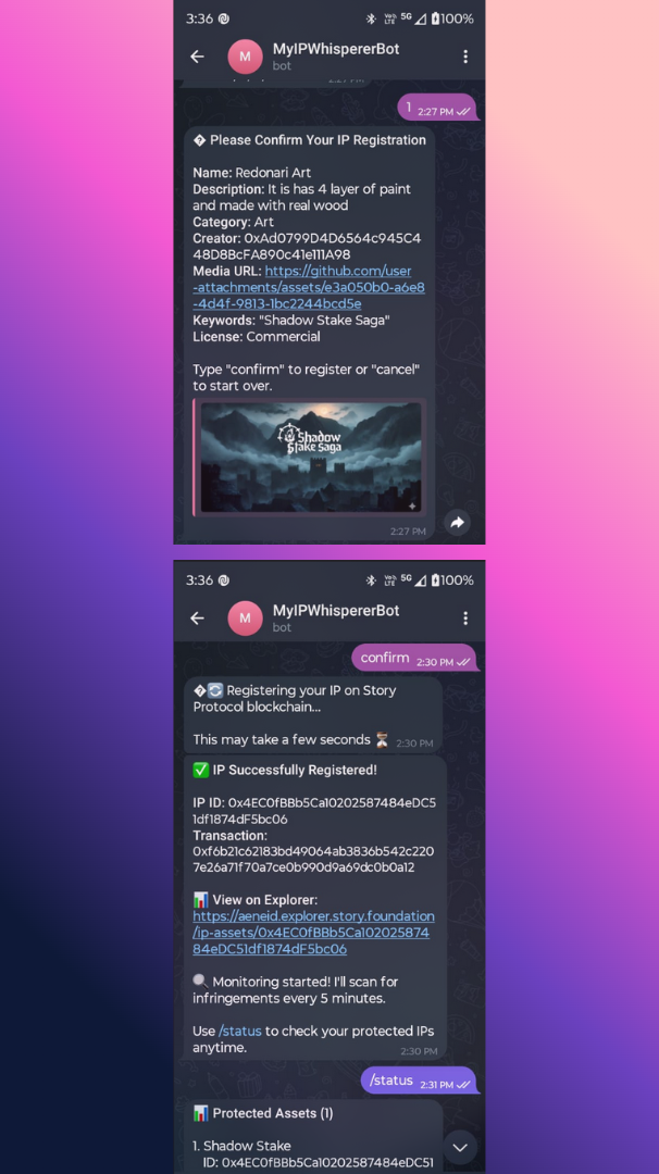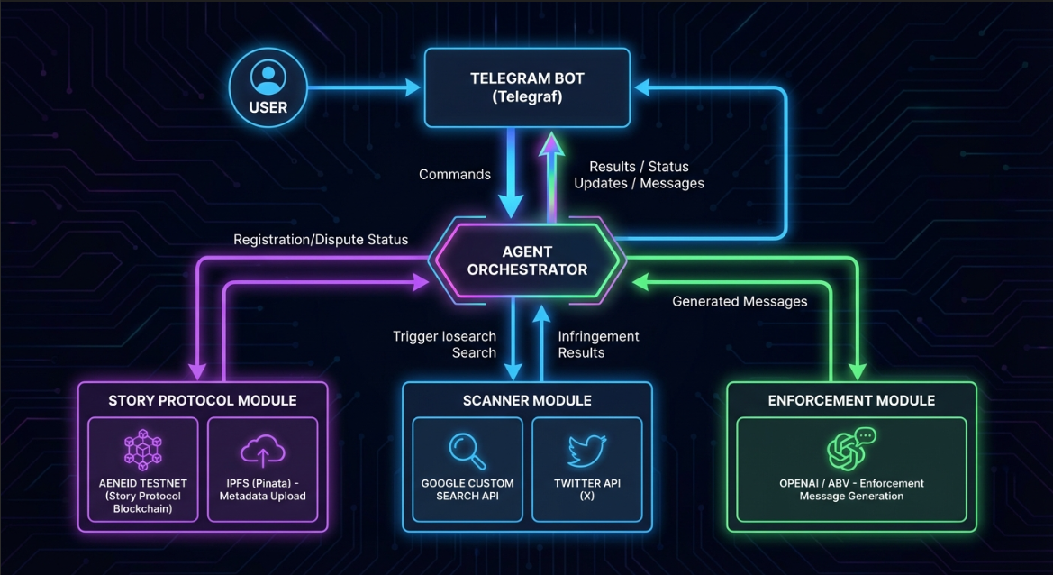 IP Whisperer is a fully autonomous AI Telegram agent that registers your content on Story Protocol, monitors the internet for theft, and enforces your rightsāwithout you touching a dashboard or writing a single line of code.