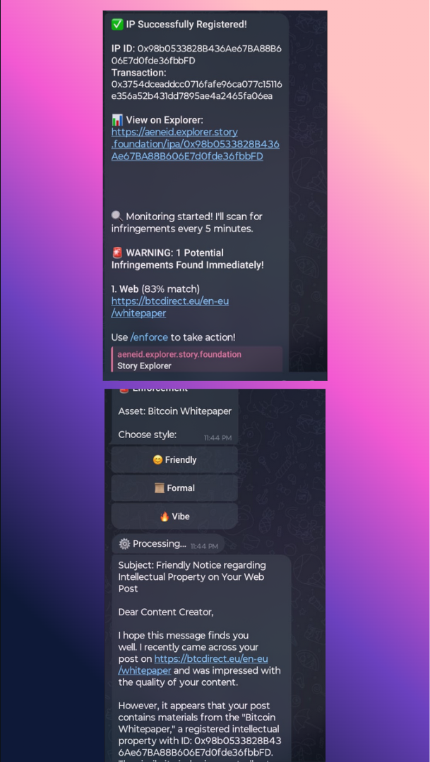 When you click āEnforce,ā the bot automatically raises a dispute on Story Protocol.