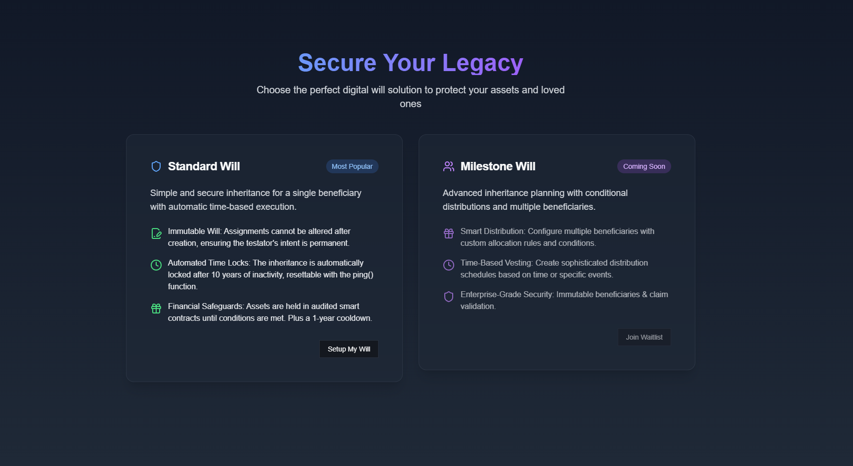 🔹 Normal Wills – Single-beneficiary inheritance with a 10-year inactivity lock. 🔹 Milestone Wills – Multi-phase distributions triggered by custom time-based conditions (e.g., graduation, course completion).