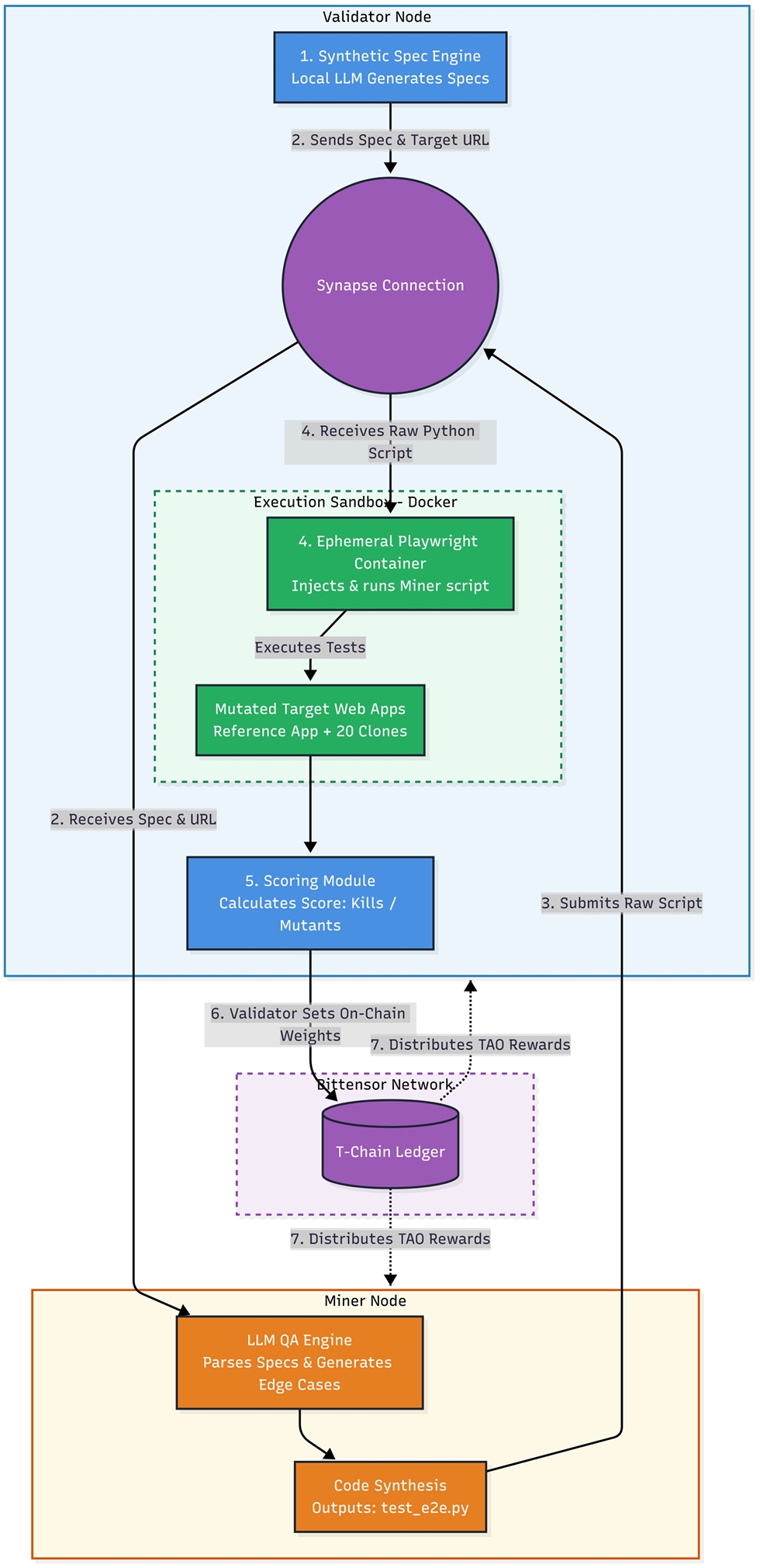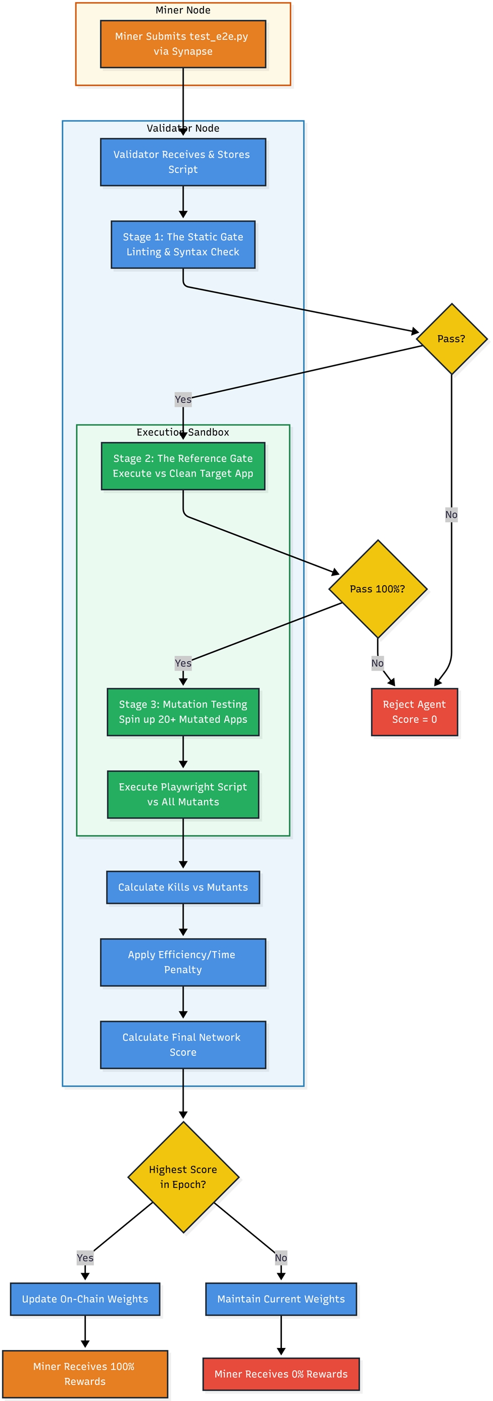 Black-Box Mutation Testing: The Validator spins up 20+ "Mutated" Docker containers—versions of the target app with deliberate backend and frontend bugs injected. Miners are evaluated and rewarded strictly on their "Kill Ratio" (their ability to successfully detect and fail the mutated bugs).