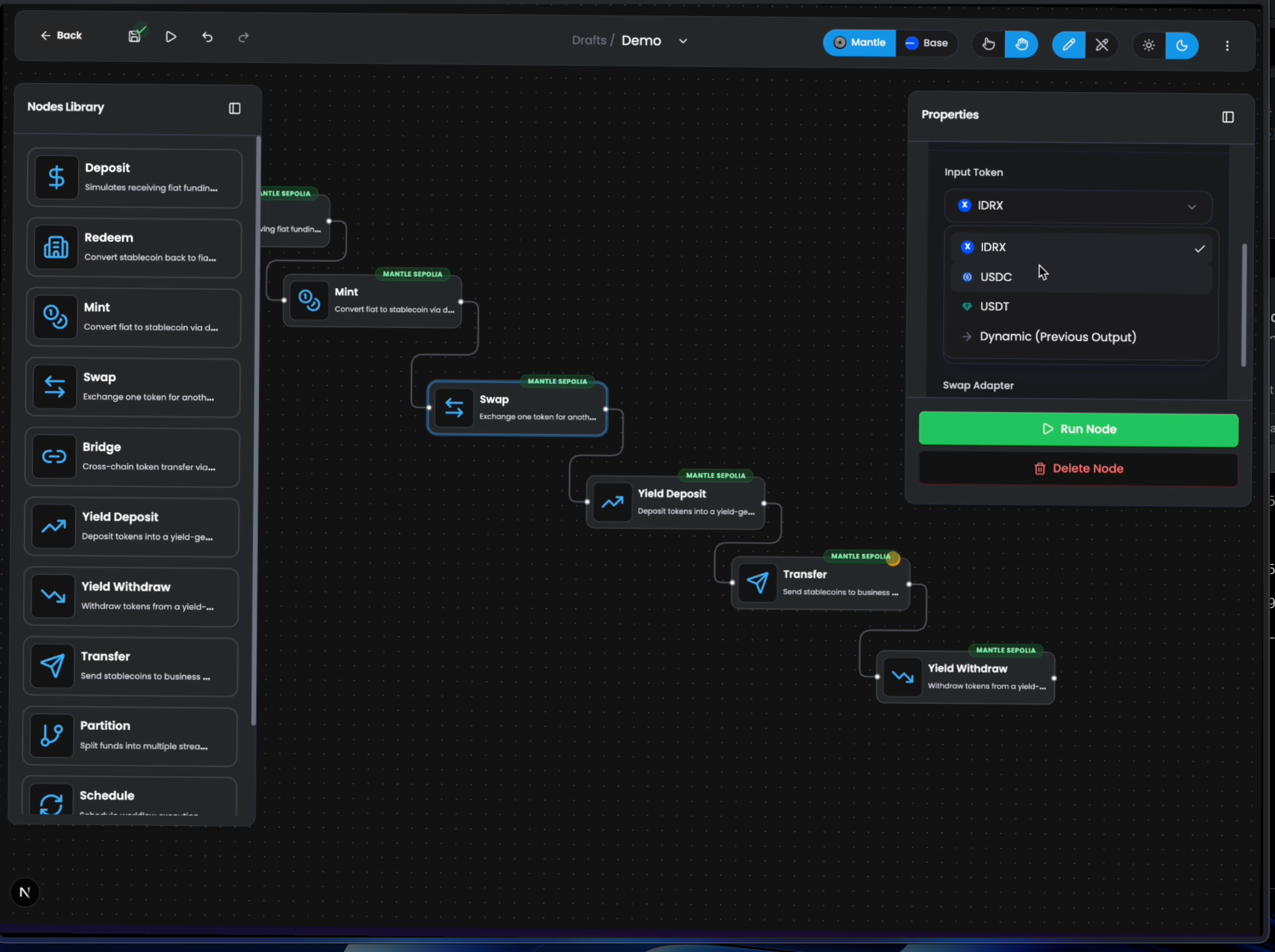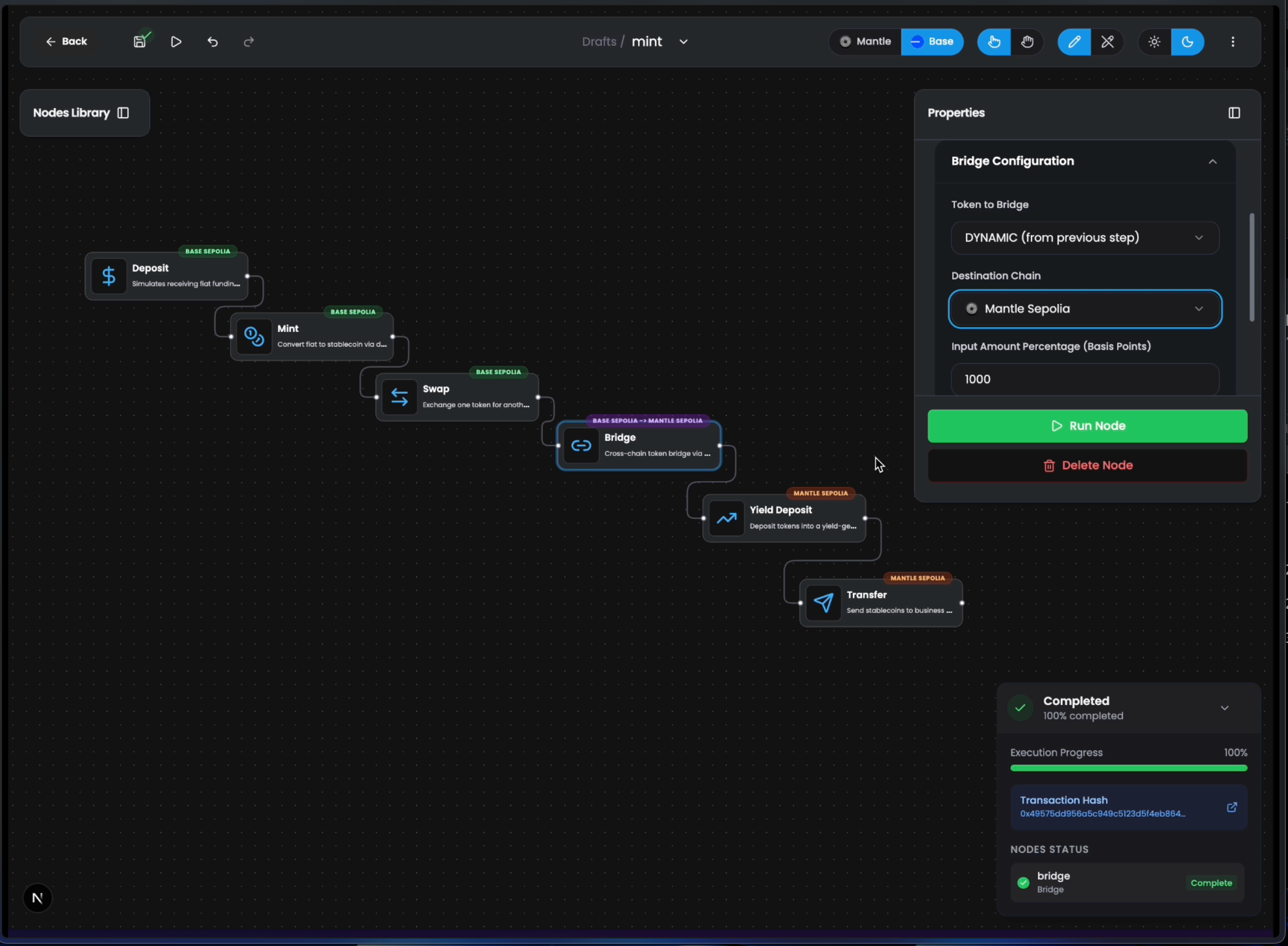 Design custom financial routes by arranging modular nodes for minting, swapping, bridging, and yield management without writing code.