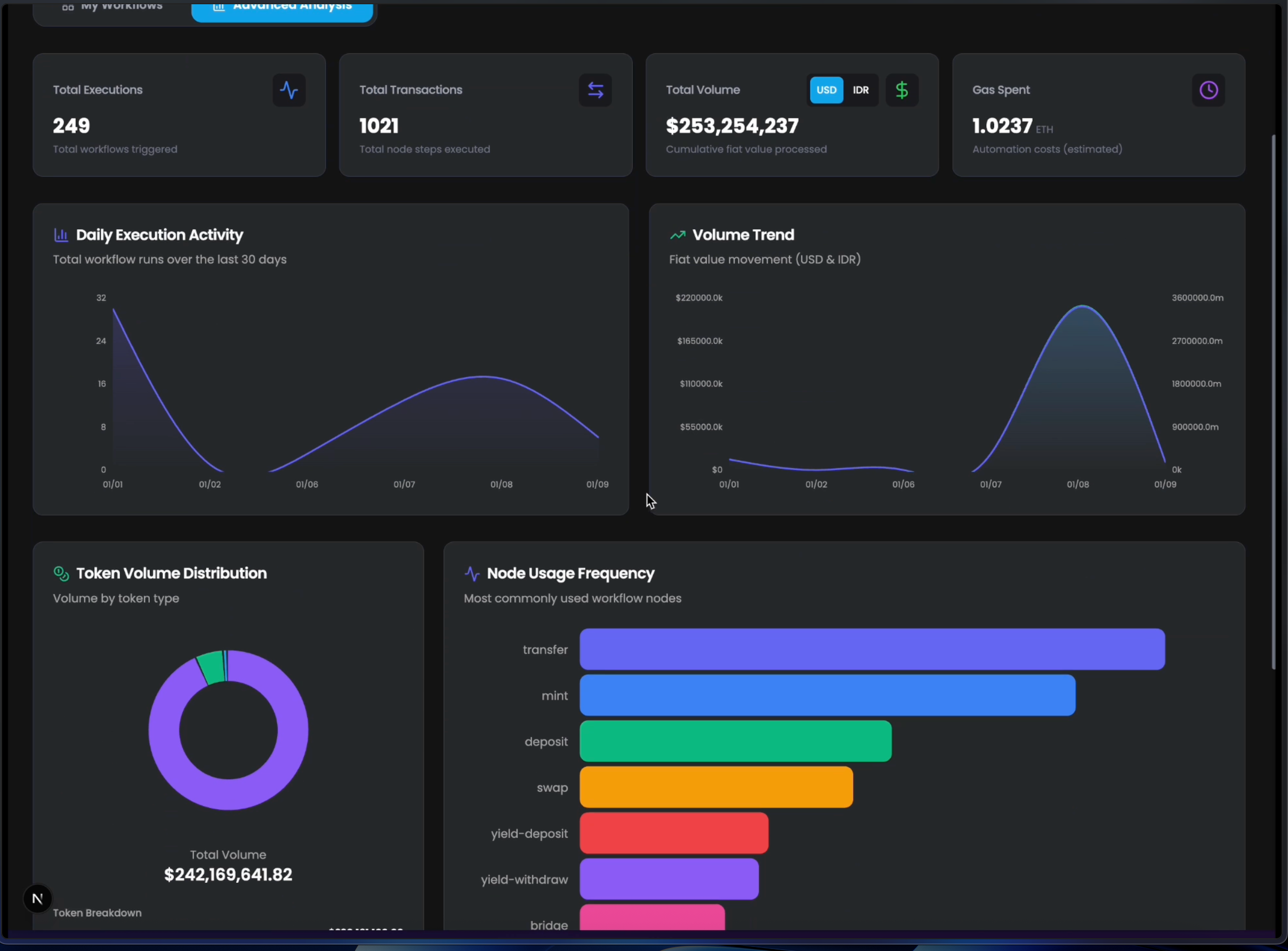 Optimize corporate strategy by monitoring total volume, transaction success rates, and real-time gas consumption in one interface.
