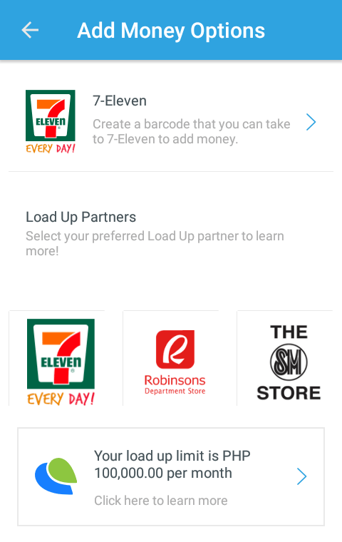 Load up at 7-Eleven Cliqq kiosks, Robinson's Department Stores, and SM Business Centers, through BDO online and mobile banking, and selected Smart Padala stores.
