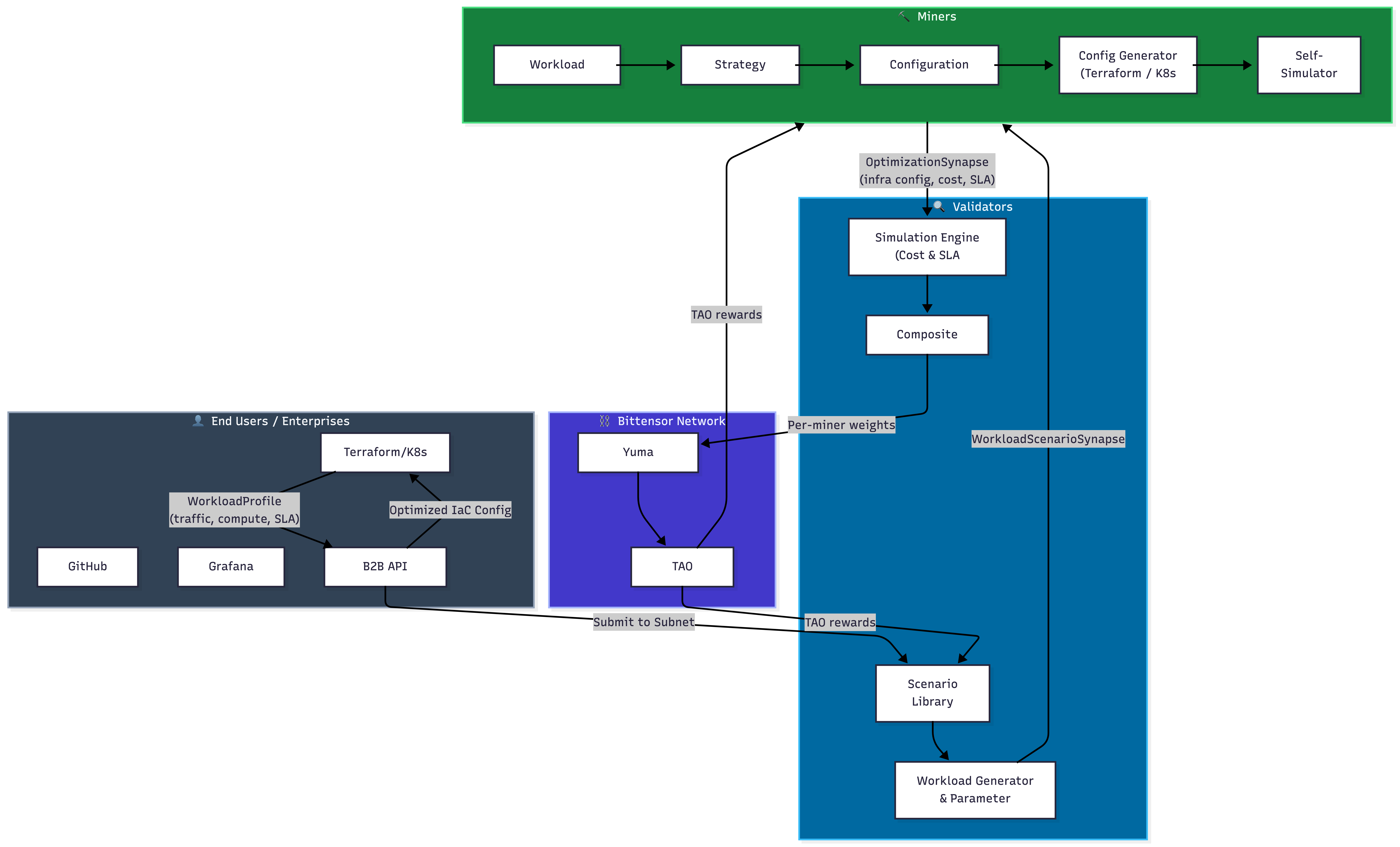 The Miners (Autonomous FinOps Agents): Miners act as specialized financial operations (FinOps) agents that compete to discover the absolute cheapest and most efficient cloud infrastructure configurations. They analyze workload profiles and synthesize actual Infrastructure-as-Code (like Terraform or Kubernetes).