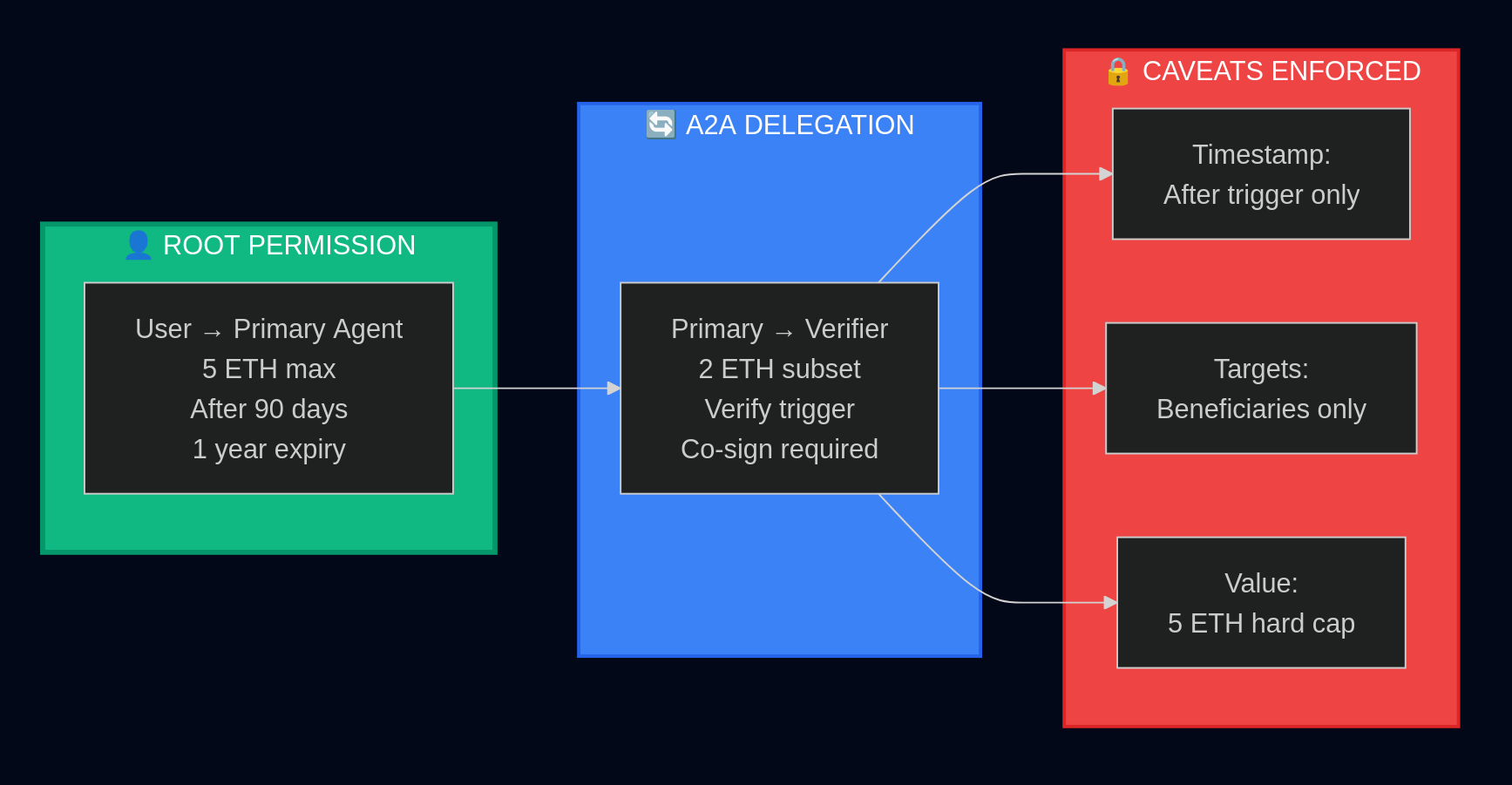 (Optional) The Executor Agent re-delegates partial permission to a Verifier Agent (A2A flow)