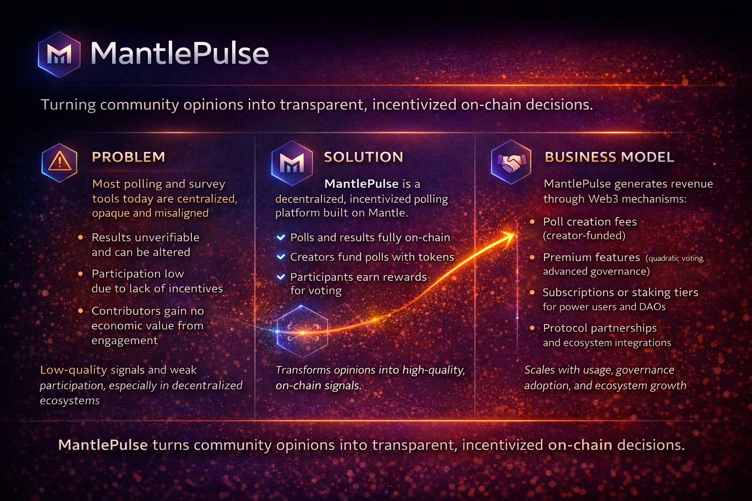 By combining smart-contract–enforced transparency, modular poll management, and token-based incentives, MantlePulse provides a scalable foundation for decentralized governance, community feedback, and on-chain decision-making—optimized for Mantle’s low-cost, high-performance execution environment.