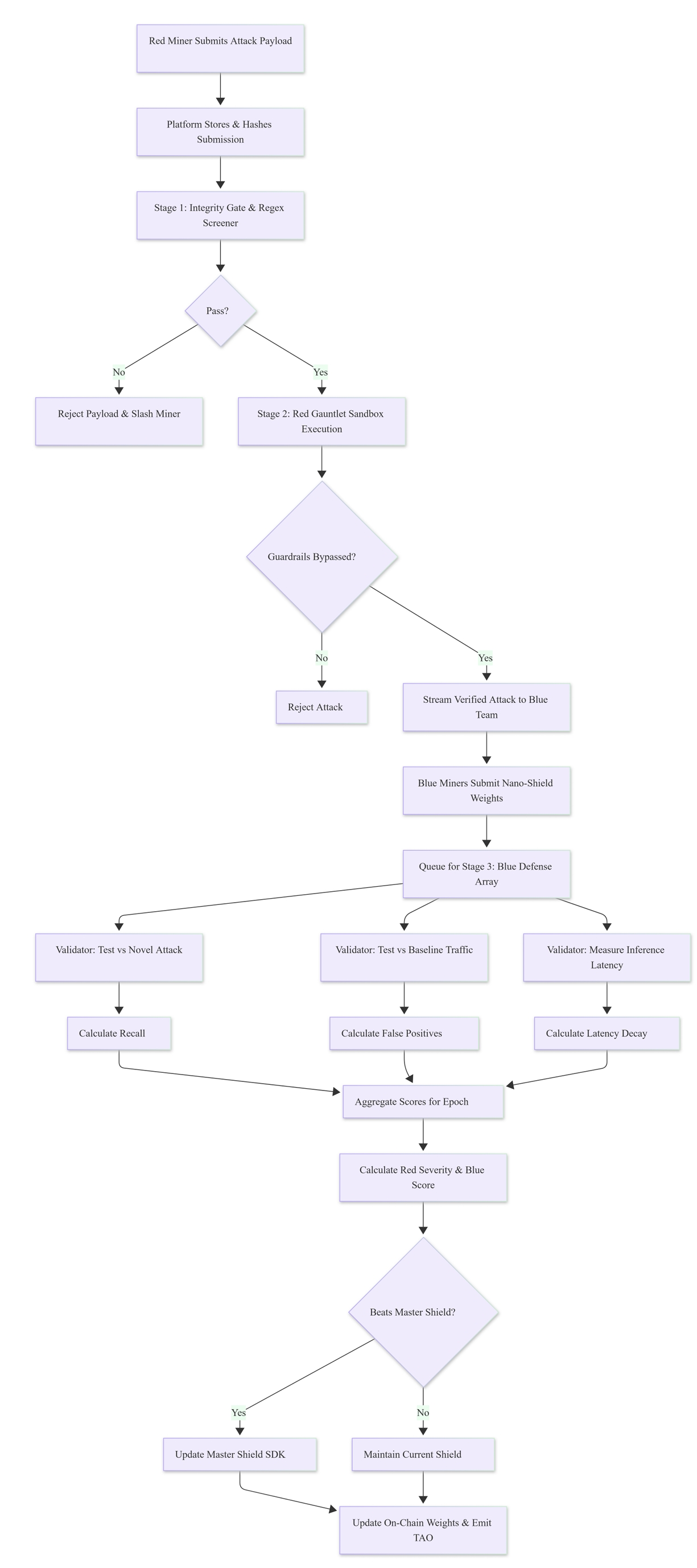 The Blue Team (Defenders): Miners ingest the live stream of successful Red Team attacks and rapidly train highly quantized "Nano-Shields" (e.g., DistilBERT classifiers) to block the exact attack pattern without flagging normal users.