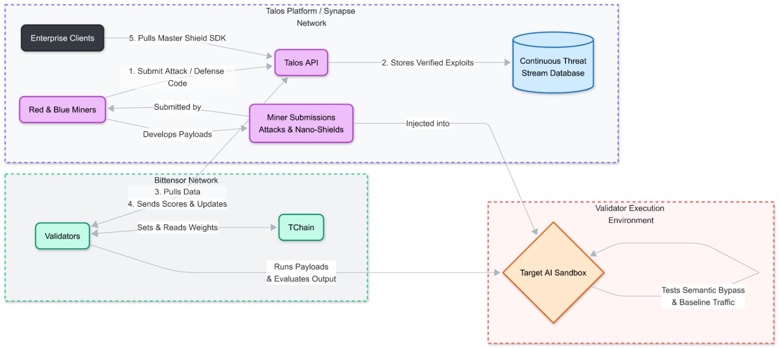 The Red Team (Attackers): Miners scout infrastructure for exposed endpoints and use Reinforcement Learning to generate novel, semantic adversarial prompts that bypass target guardrails.