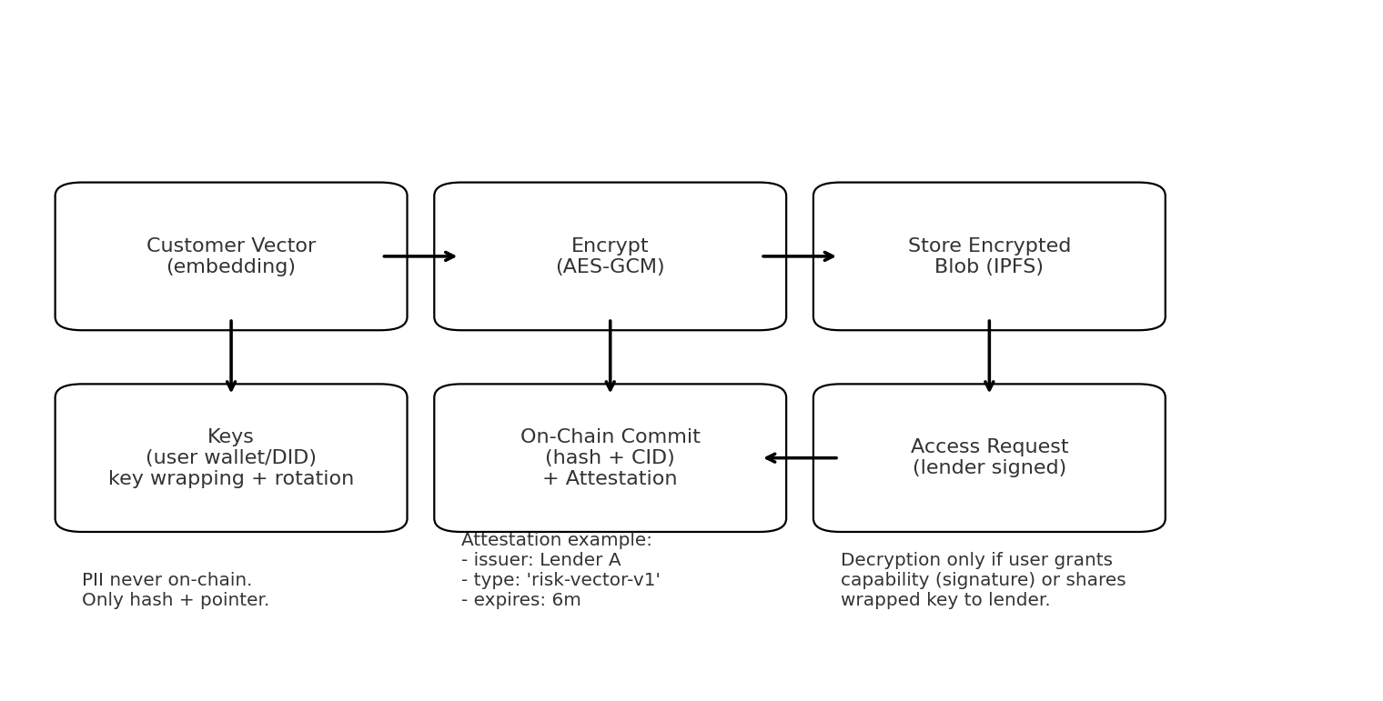 By committing only encrypted representations or cryptographic hashes of customer vectors and alternative data features to a distributed ledger, the system prevents unauthorized access to sensitive information while still providing regulators and counterparties with tamper-proof proofs of data integrity and model usage. This design directly addresses risks highlighted by incidents such as the CIC data breach, shifting control over credit data back to borrowers while enabling transparent and verifiable credit risk management.