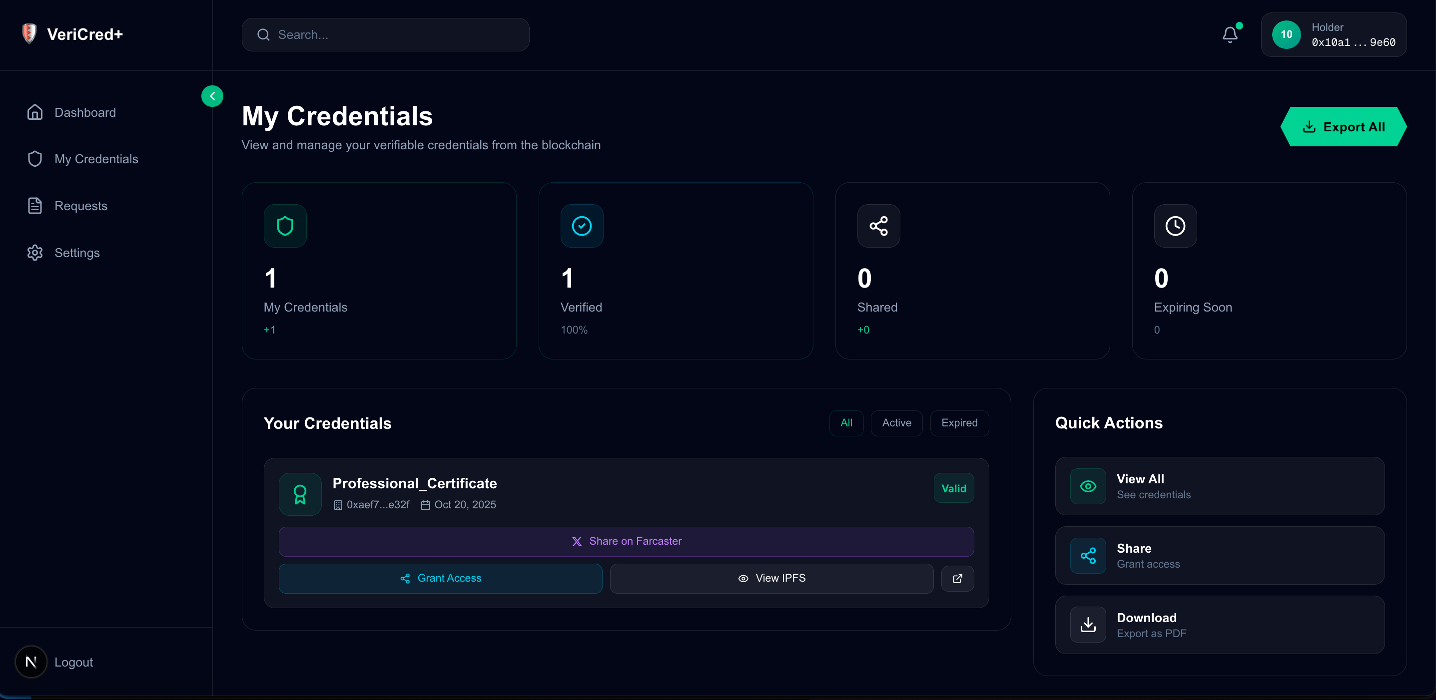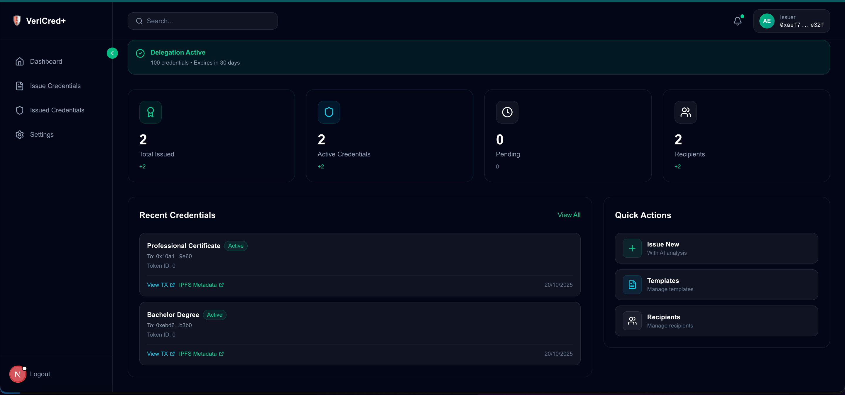 VeriCred+ demonstrates the convergence of AI, delegation, and real-time blockchain indexing to solve a multi-billion dollar problem. Our implementation showcases: