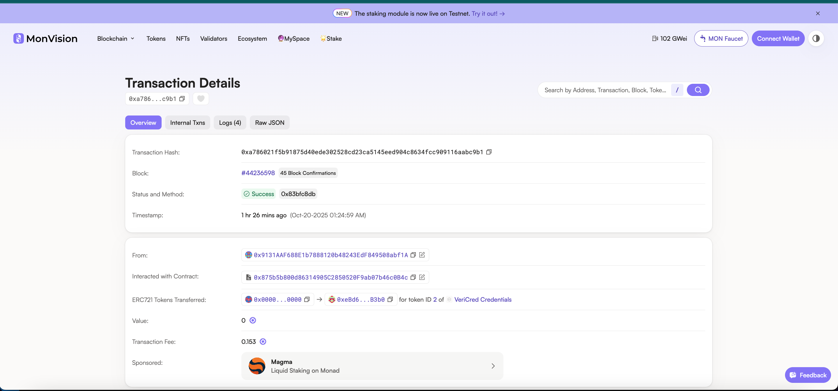 events from VeriCred SBT contract on Monad Testnet.Track Qualifications