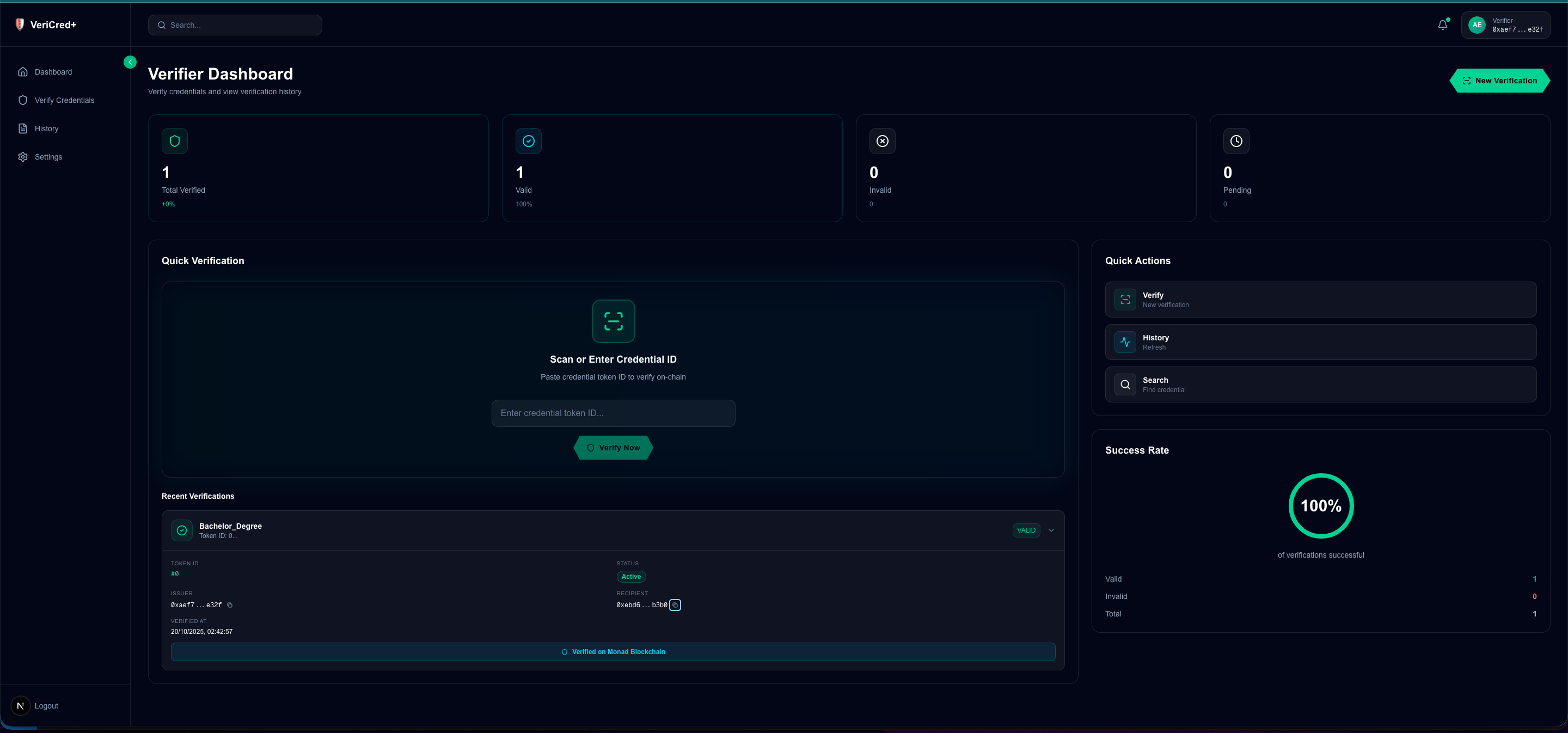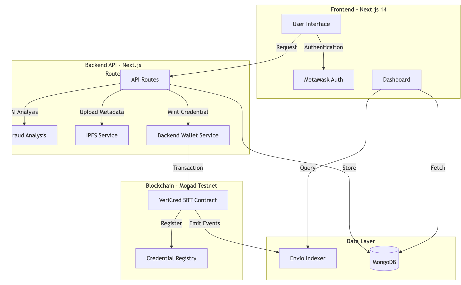 ✅ Completed Features 1. Smart Contract Development (Monad Testnet) Deployed VeriCredSBT contract (Soulbound NFT) at 0x875b5b800d86314905C2850520F9ab07b46c0B4c Deployed CredentialRegistry contract at 0xBc0E4fAdcfD447D084C2EC66D5265d7F714eDdCE. Implemented role-based access control (ISSUER_ROLE, VERIFIER_ROLE) Added credential revocation and metadata update functionality 2. MetaMask Delegation Integration Implemented MetaMask Smart Account creation (Hybrid implementation) Built delegation flow with caveats (allowed methods, call limits, time windows) Users delegate credential issuance rights once - no repeated signatures needed Backend wallet executes transactions on behalf of issuers using delegations 3. AI-Powered Fraud Detection Integrated OpenAI GPT-5-nano for analyzing recipient on-chain activity AI checks transaction patterns, account age, and fraud signals before issuance Real-time risk assessment with confidence scores 4. Full-Stack Application Issuer Dashboard: Setup delegation, issue credentials with AI verification Verifier Dashboard: Verify credentials by token ID, view credential details Recipient Dashboard: View owned credentials, share via QR codes MongoDB database for fast credential storage and queries IPFS/Pinata integration for decentralized metadata storage 5. Envio HyperIndex Integration Created indexer configuration for VeriCredSBT and CredentialRegistry contracts Real-time GraphQL API for querying credentials, issuers, and events Run locally (hosted deployment unavailable during hackathon) Provides trustless verification of on-chain credential data 6. Farcaster Frames Integration Built Frame endpoints for social media credential sharing Verify credentials directly in Farcaster feeds 🔧 Technical Achievements Next.js 15 with TypeScript Viem for blockchain interactions Rate limiting and authentication middleware Responsive UI with Framer Motion animations