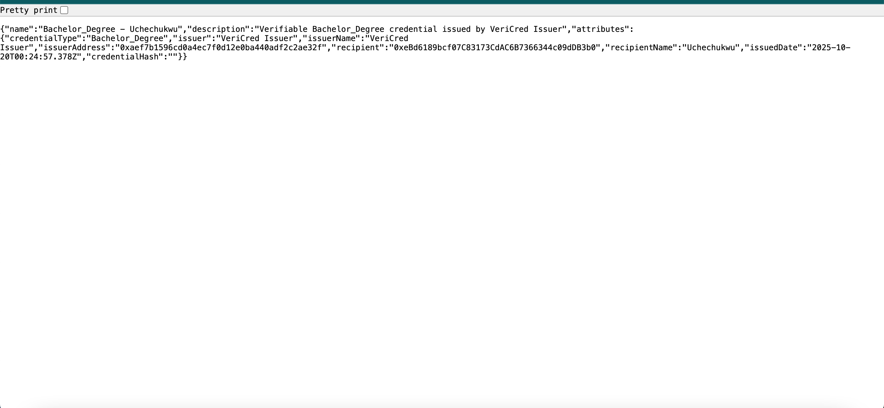 Every credential's metadata is stored on IPFS for permanent, decentralized access: