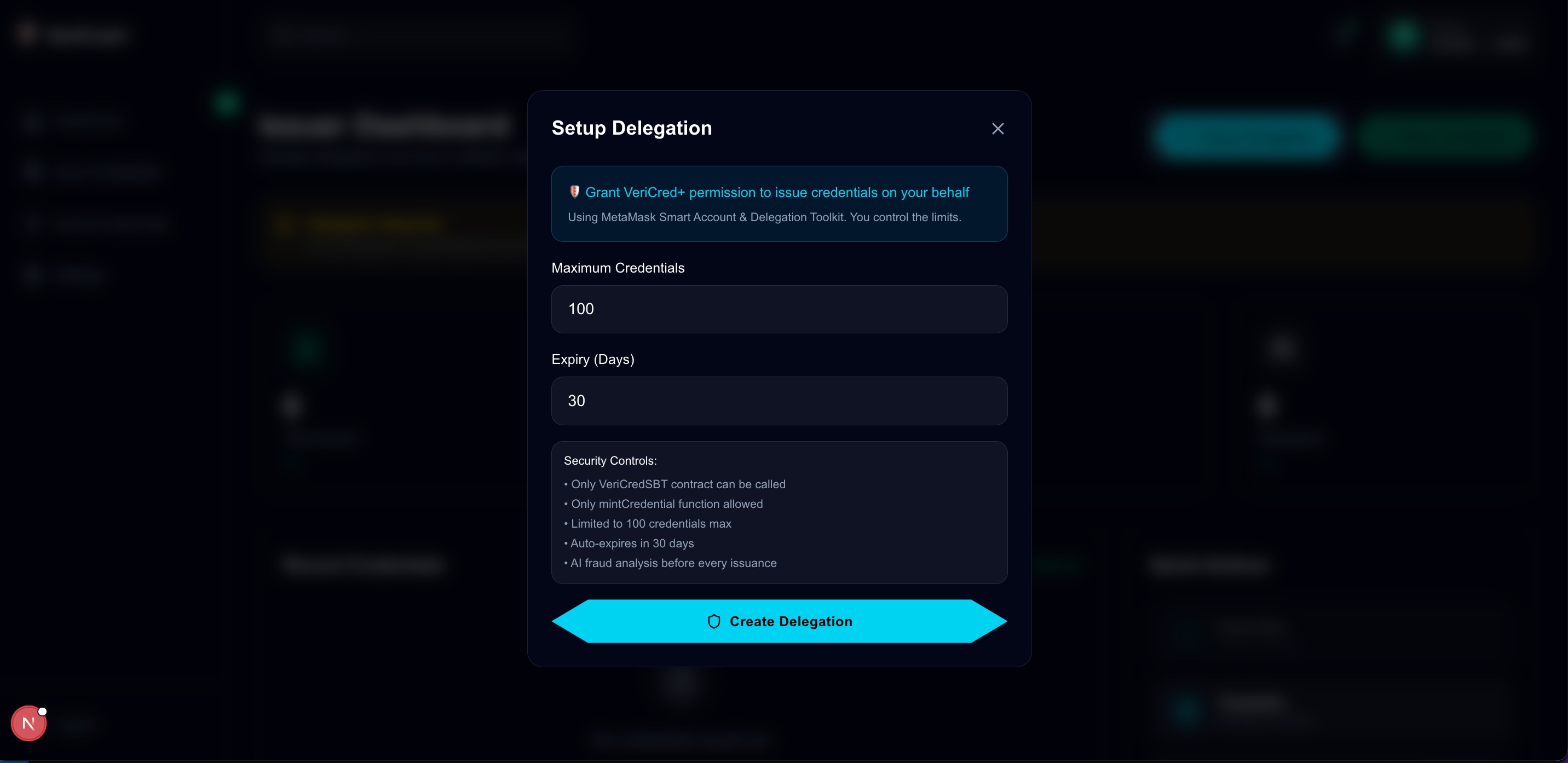 ✅ AI agent leverages delegations - Our fraud detection AI works with MetaMask delegation to automate credential issuance