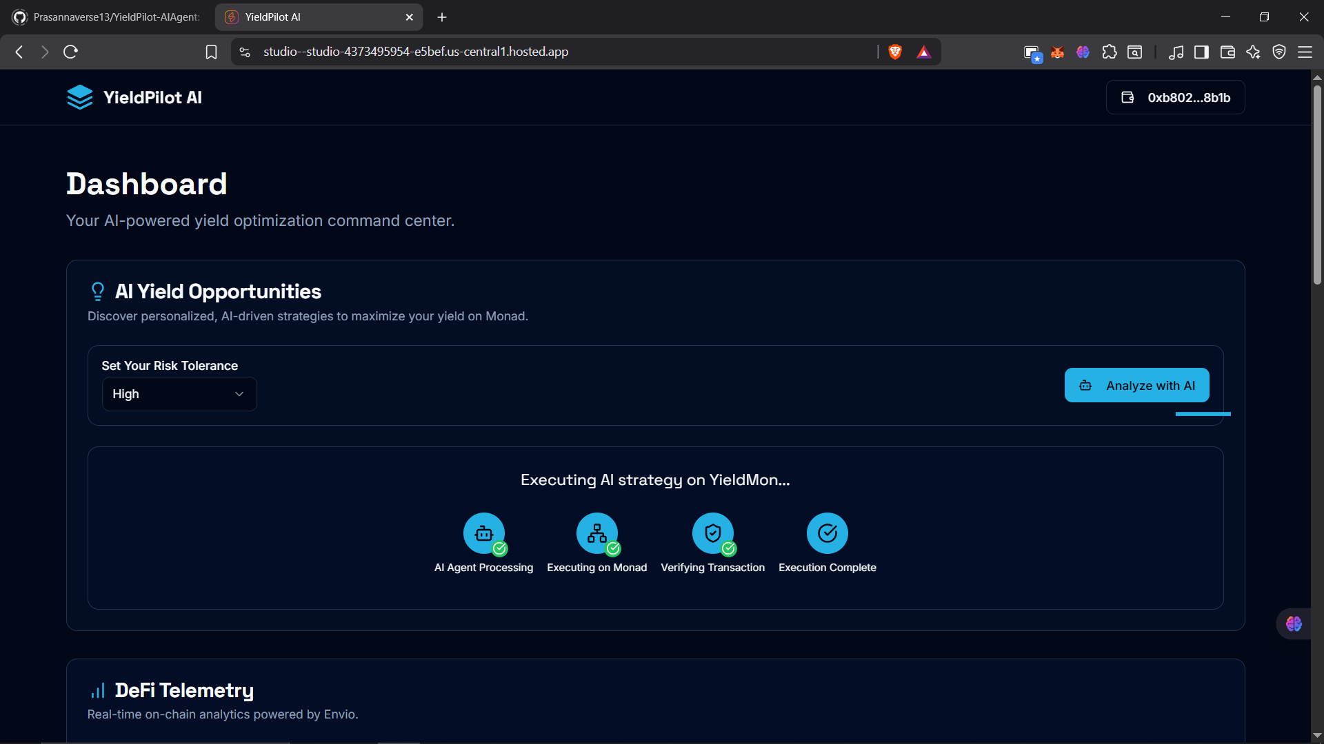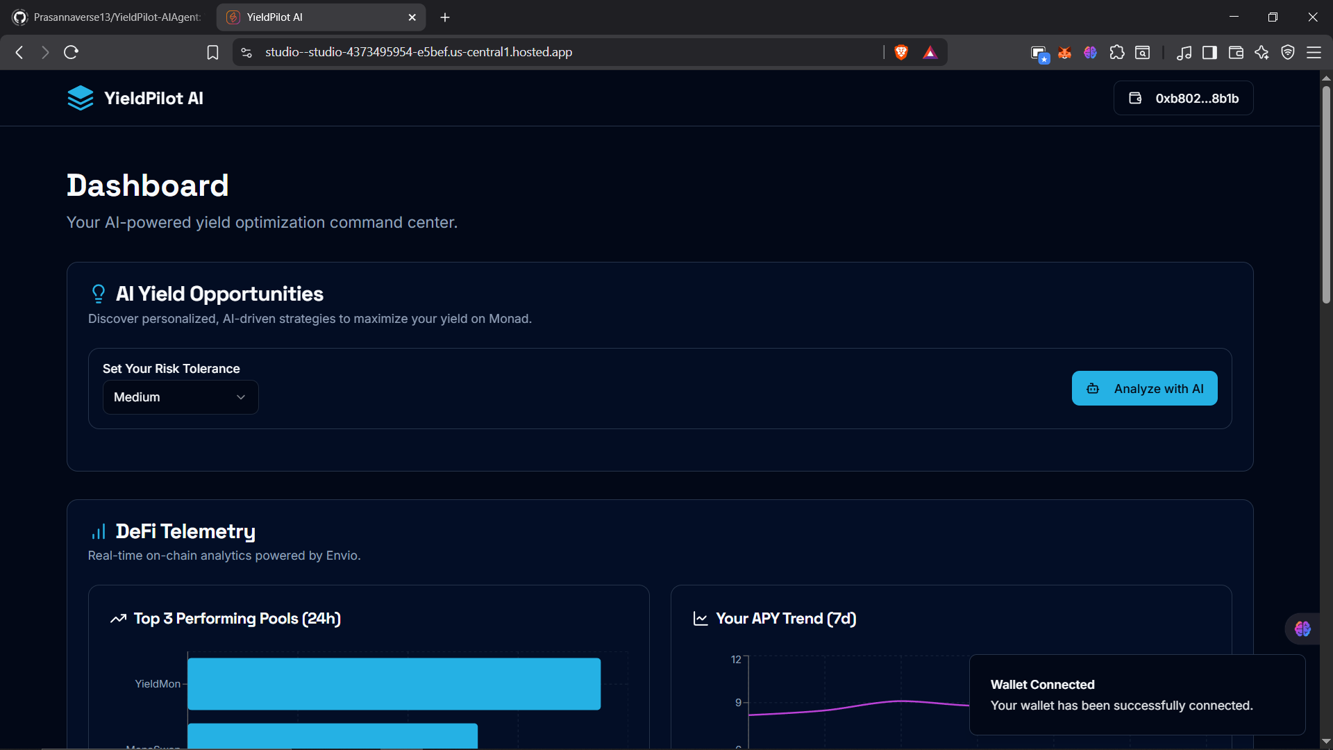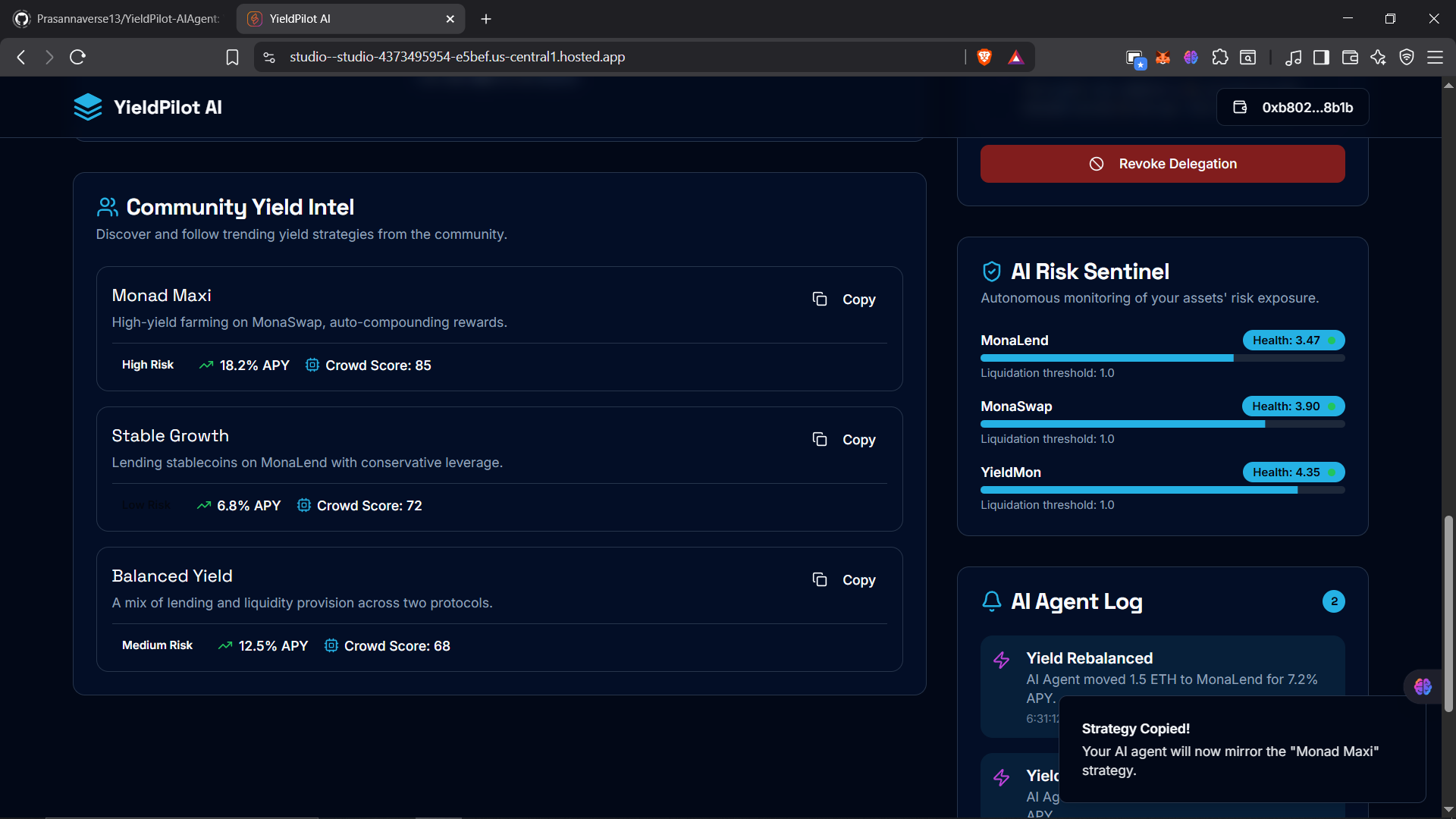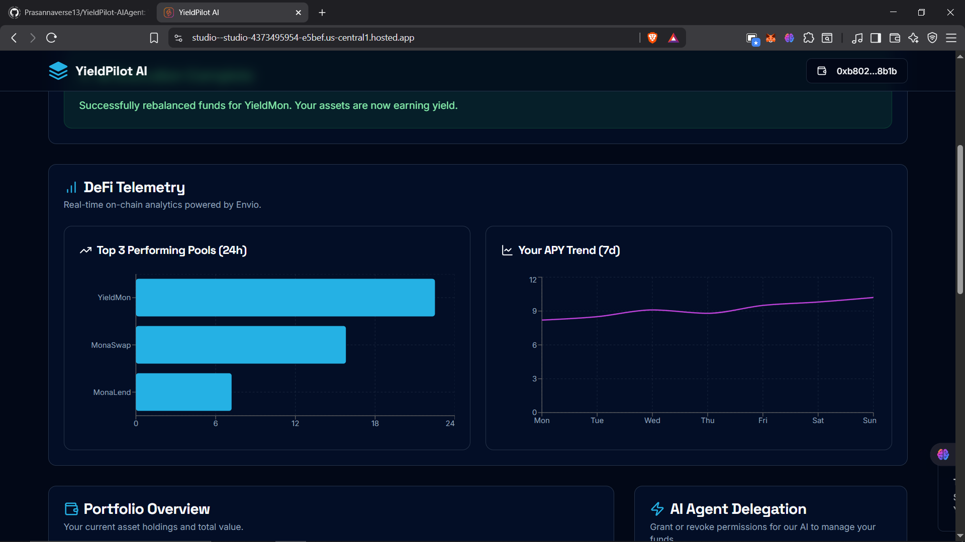 YieldPilot AI is a decentralized yield optimization platform that combines the analytical power of AI with the security of blockchain technology to automate portfolio management. Built for the Monad Hackathon, it leverages MetaMask Smart Accounts, the Delegation Toolkit, Envio indexing, and Google Gemini AI to provide a seamless and intelligent DeFi experience.