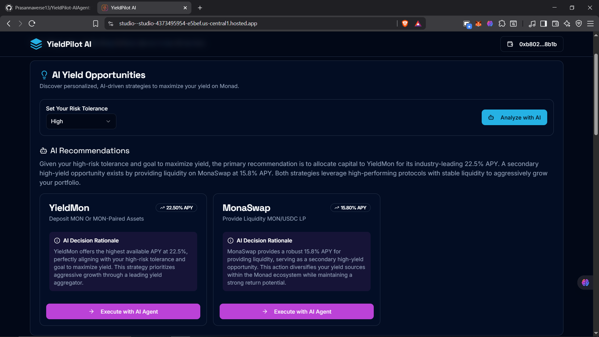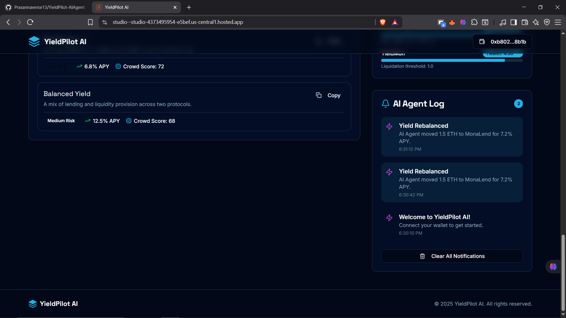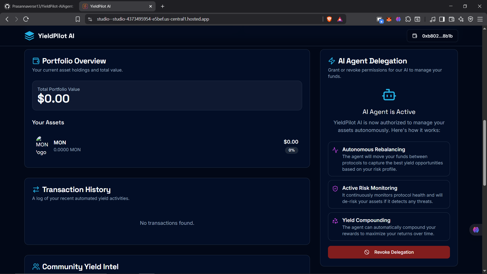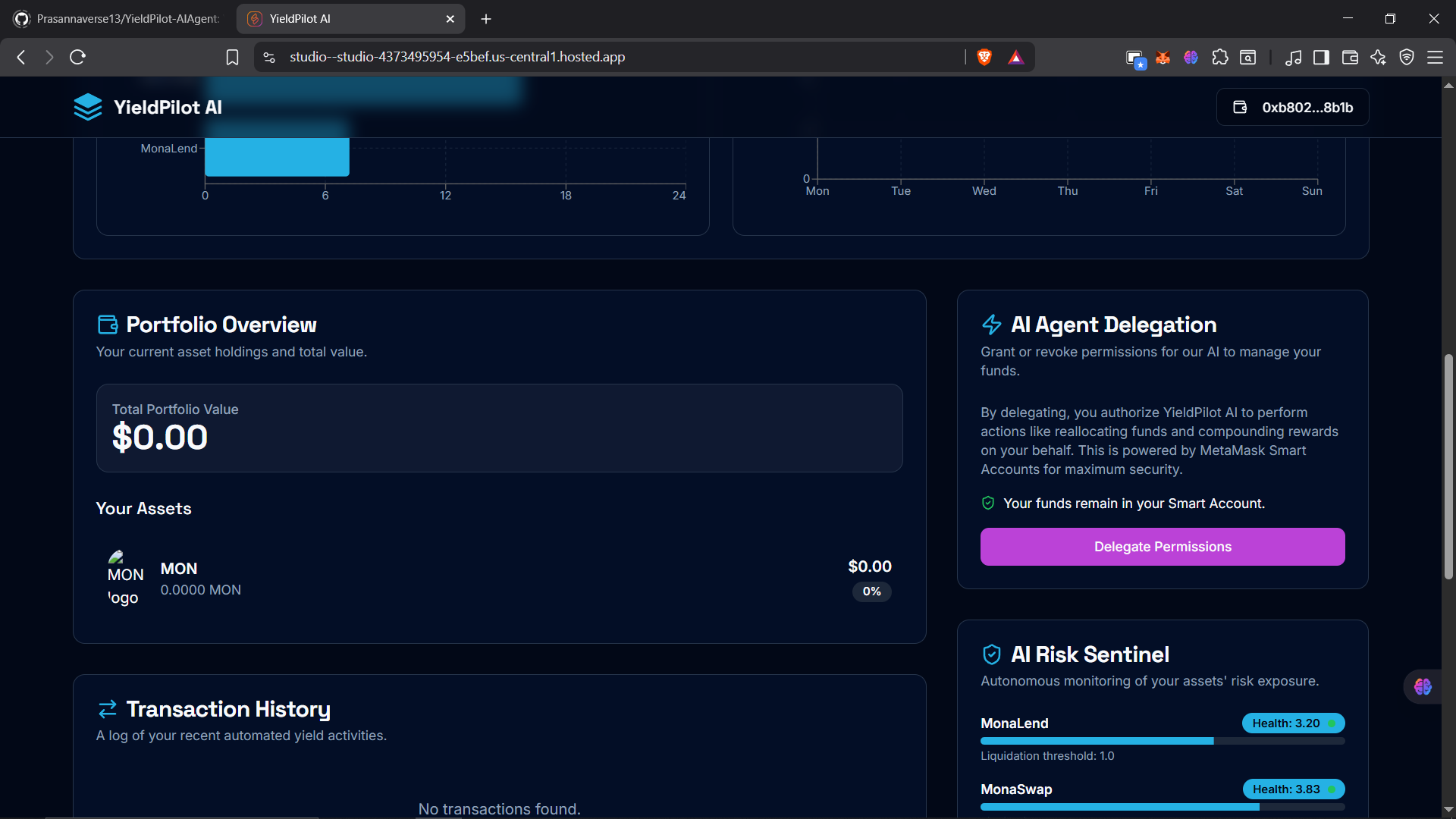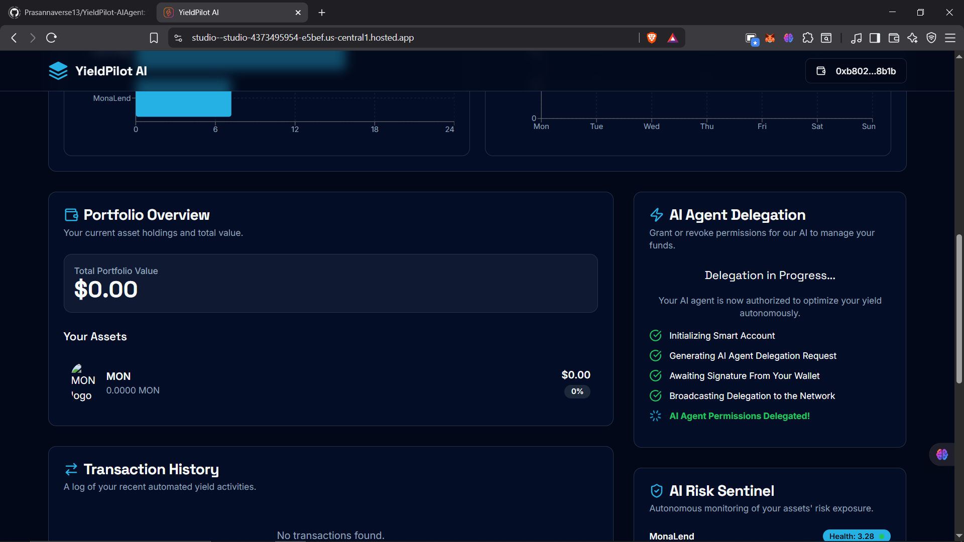YieldPilot AI is a decentralized yield optimization platform that combines the analytical power of AI with the security of blockchain technology to automate portfolio management. Built for the Monad Hackathon, it leverages MetaMask Smart Accounts, the Delegation Toolkit, Envio indexing, and Google Gemini AI to provide a seamless and intelligent DeFi experience.