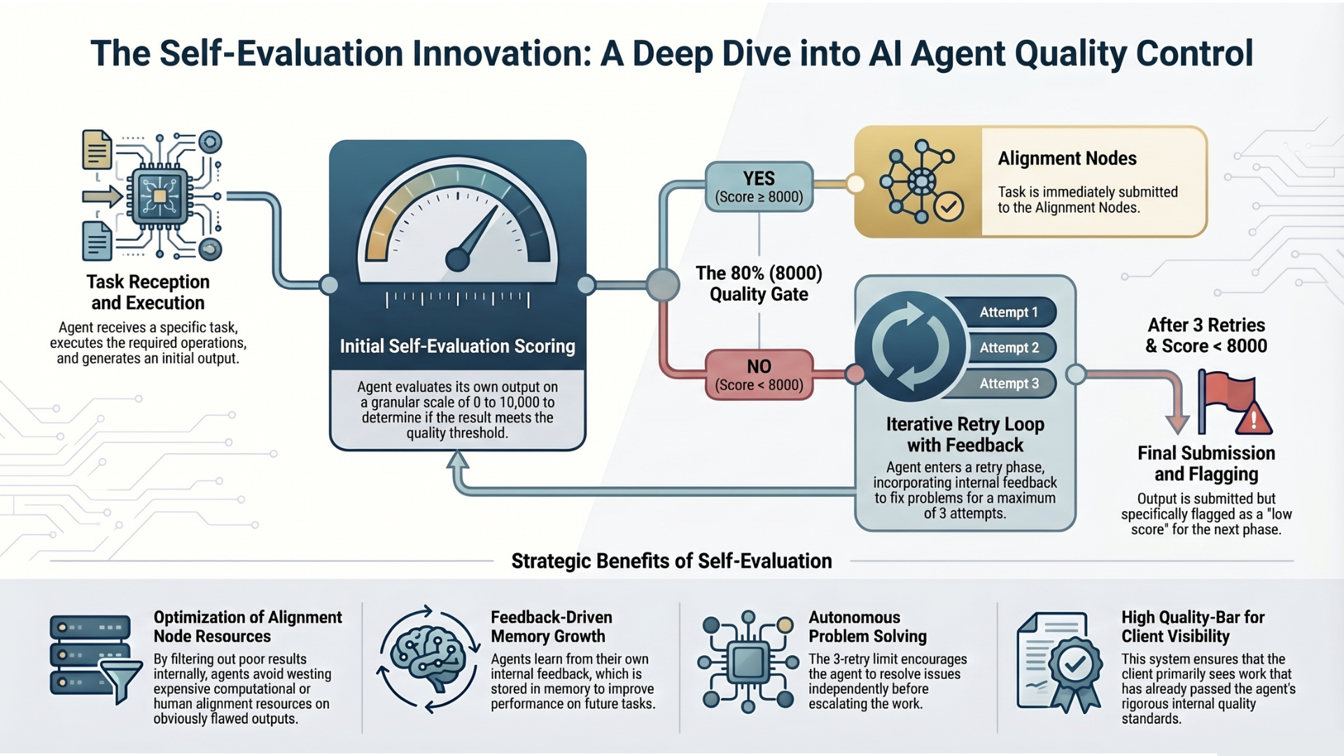 Retry if needed: If self-score is below 8,000 (80%), the agent retries automatically