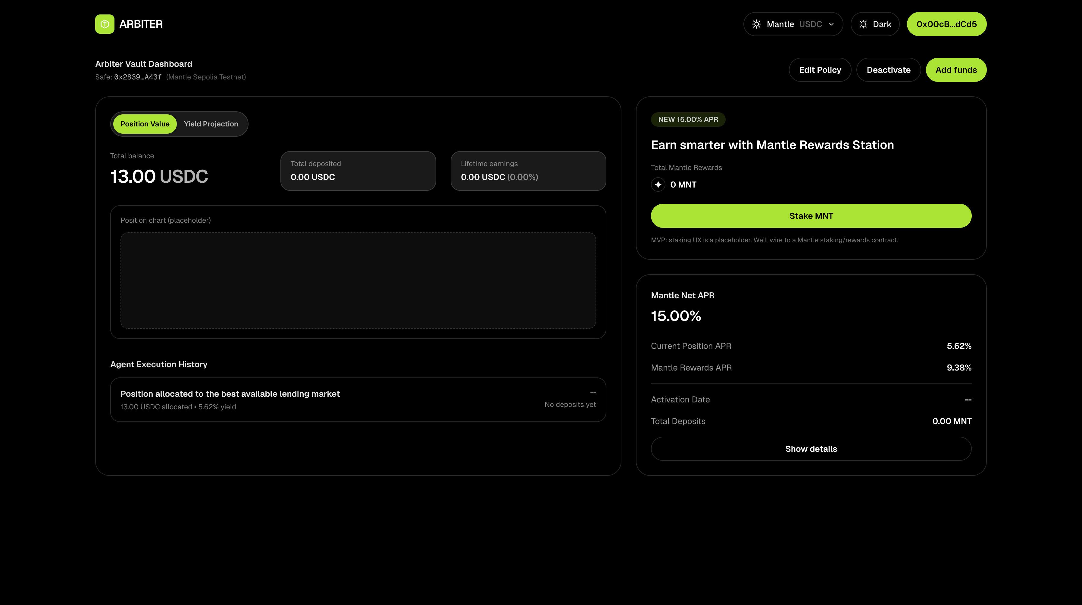 Arbiter is a Mantle-native yield optimization system that combines autonomous AI agents with zero-knowledge proof enforcement. Own a safe smart account, deposit USDC and let agent trade on proofs.