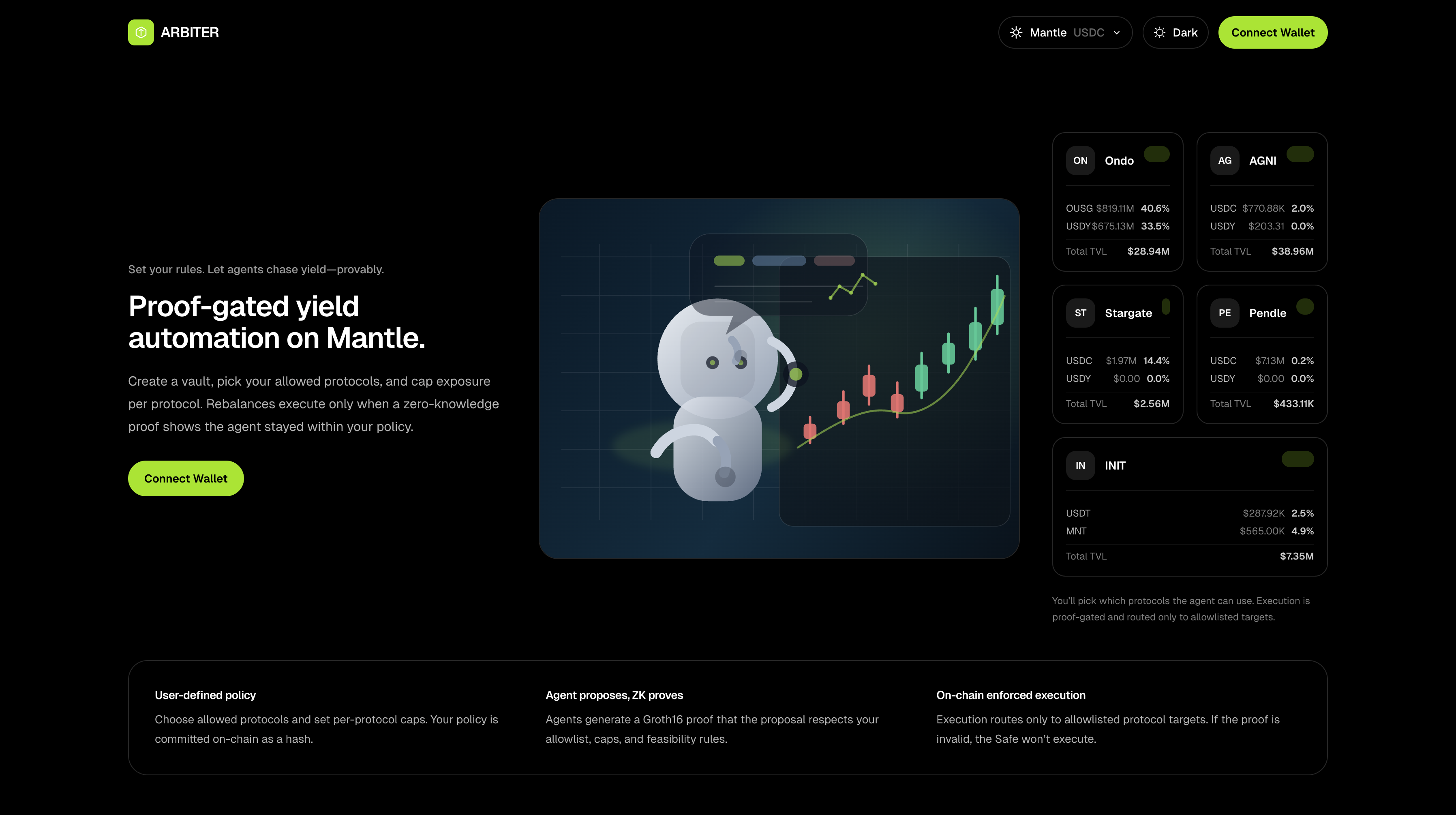 Arbiter is a Mantle-native yield optimization system that combines autonomous AI agents with zero-knowledge proof enforcement. Users deploy Safe smart account vaults, deposit stablecoins, and define policies. An AI agent continuously optimizes allocations across curated protocols—but every action requires a valid ZK proof proving compliance with the user's policy.