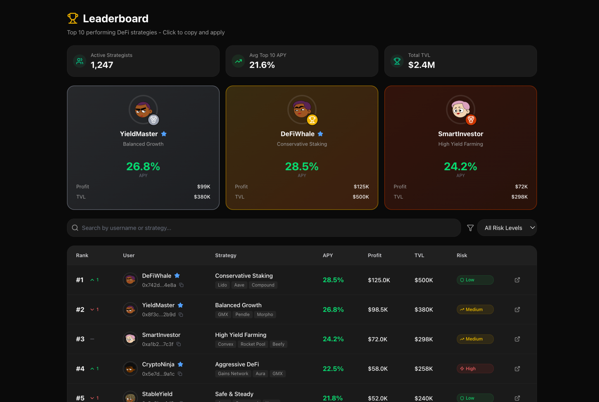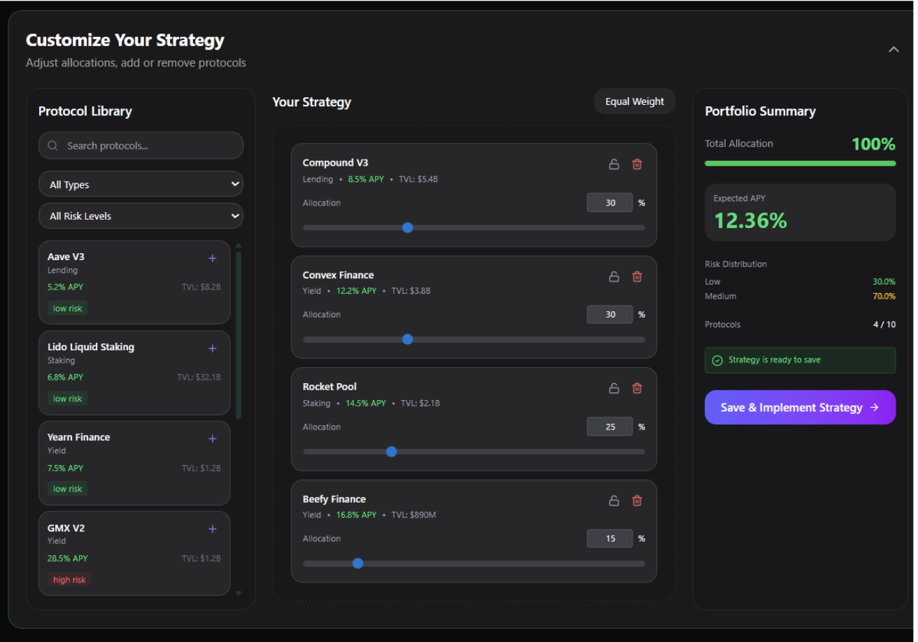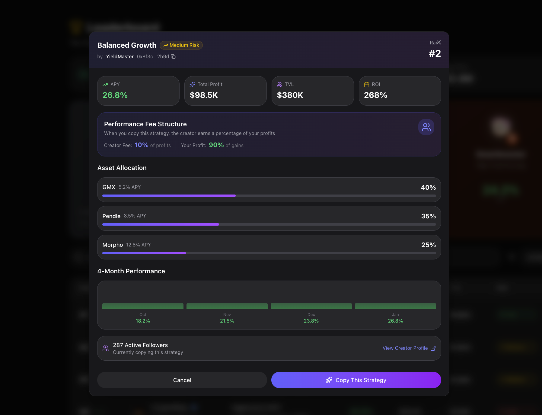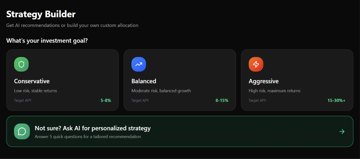 Each strategy comes with a target performance range and risk profile, allowing users to choose based on their goals.
