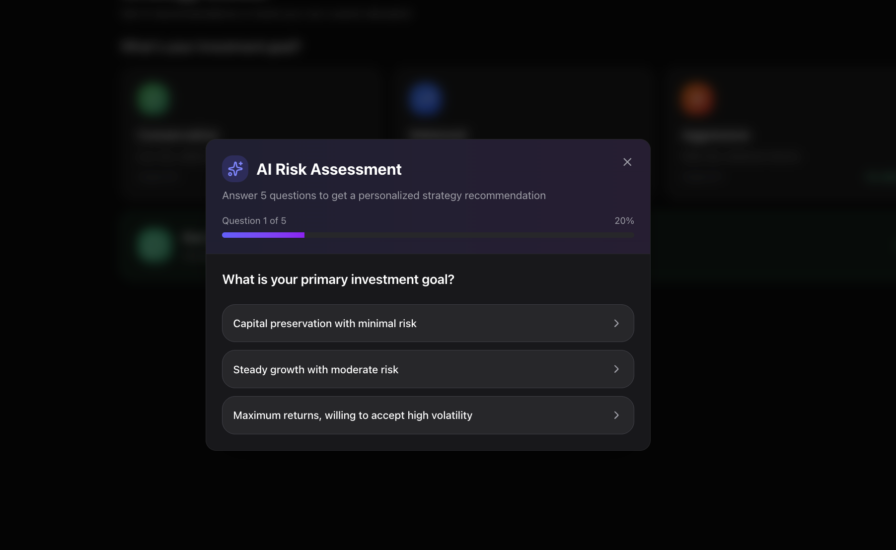 Users answer a short set of questions about goals, time horizon, and risk tolerance