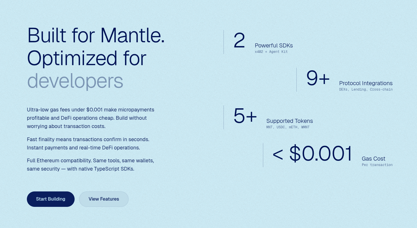 The complete developer suite for Mantle Network. Build payments, DeFi applications, and AI-powered blockchain agents with production-ready SDKs and tools. Payments and DeFi with a Few Lines of Code