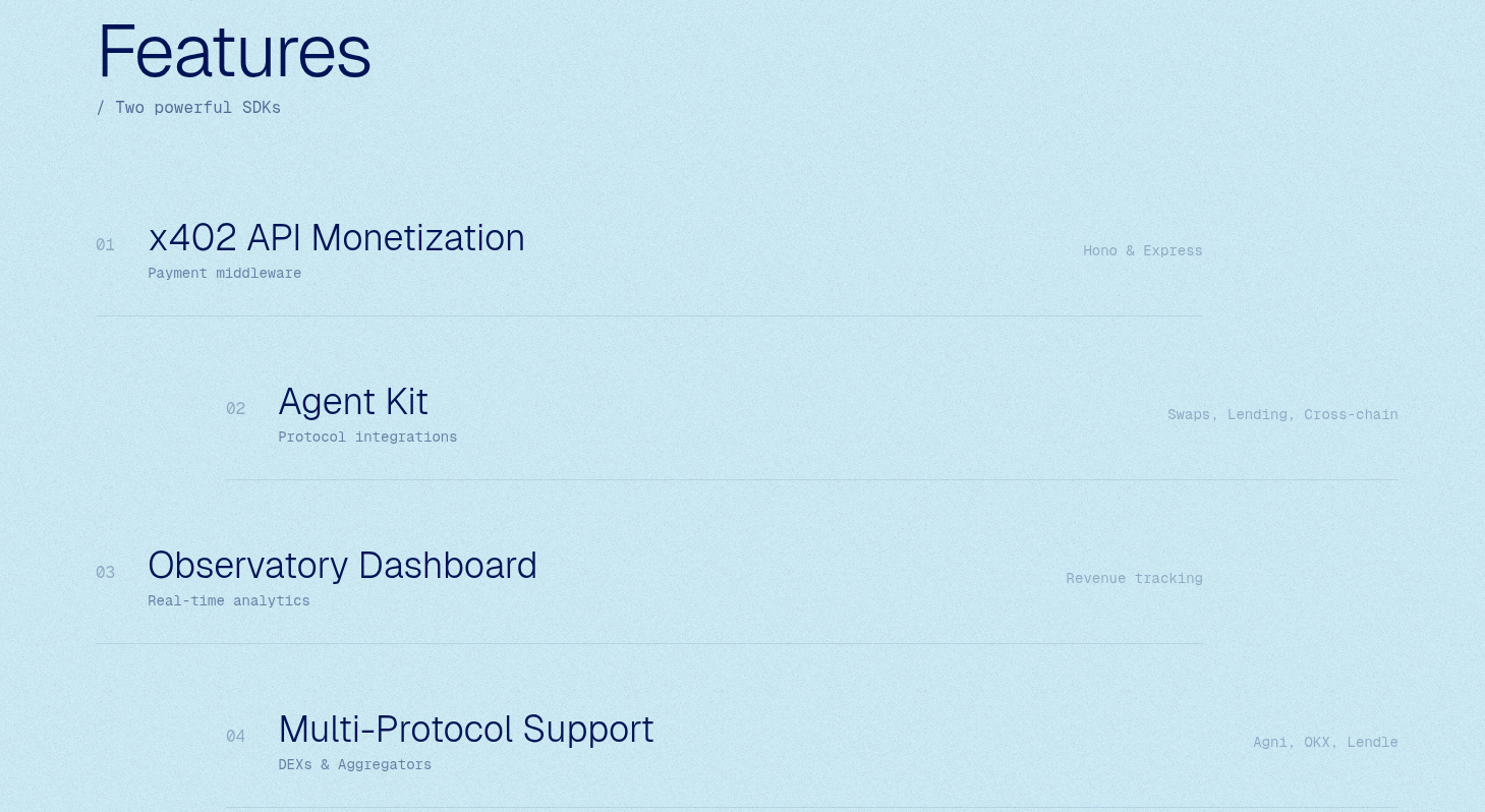 Agent Kit SDK: TypeScript library providing protocol abstraction layer. Handles ABI encoding, transaction simulation, gas estimation, and response parsing for all integrated protocols.
