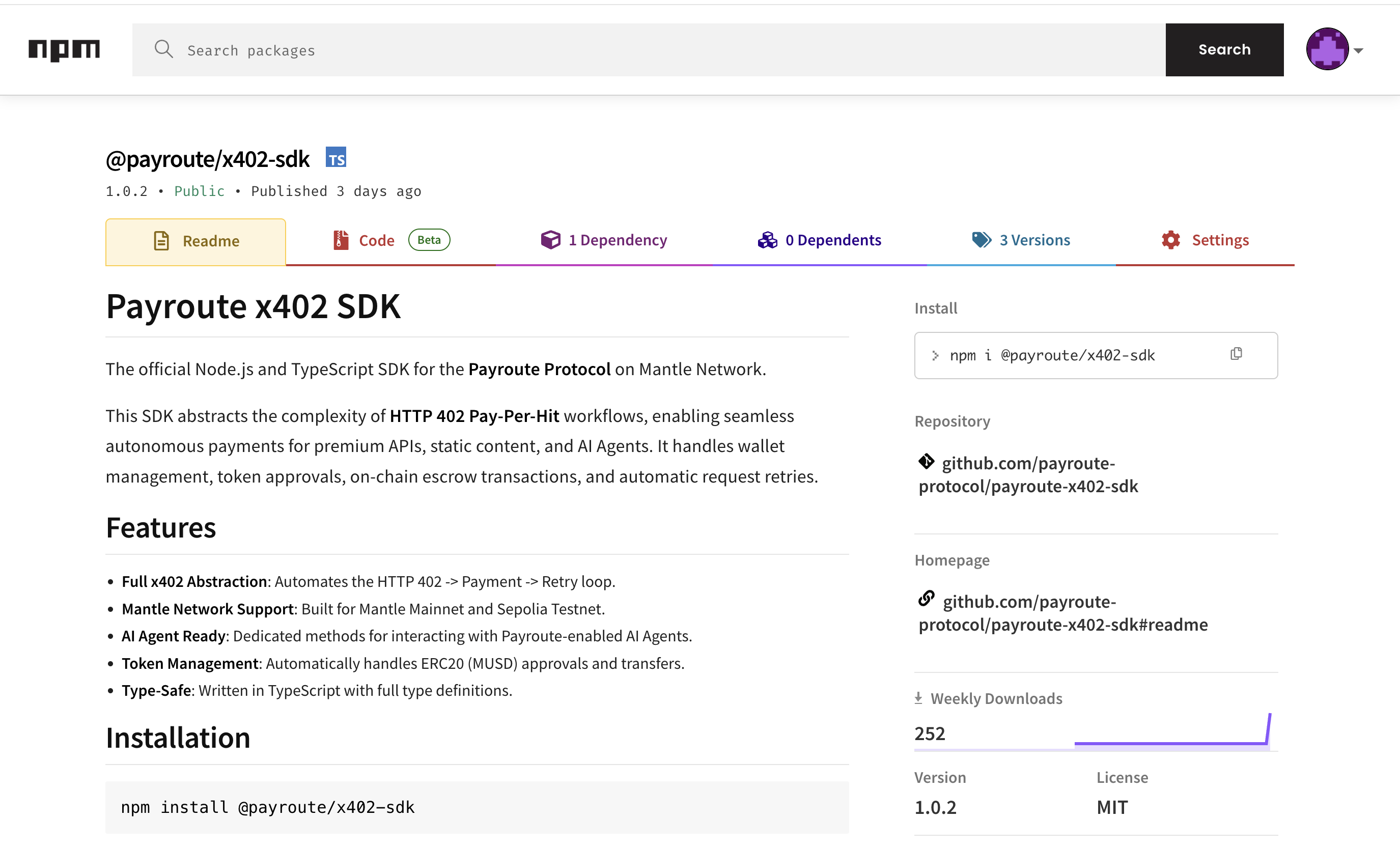 NPM Link : https://www.npmjs.com/package/@payroute/x402-sdk