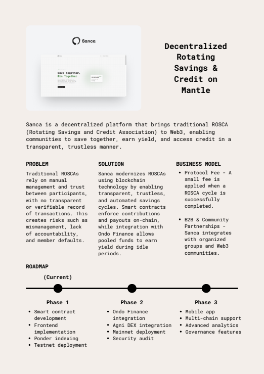 Sanca is a decentralized platform that brings traditional ROSCA (Rotating Savings and Credit Association) to Web3, enabling communities to save together, earn yield, and access credit in a transparent, trustless manner. Built on Mantle Network with integration to Ondo Finance for institutional-grade yield generation.