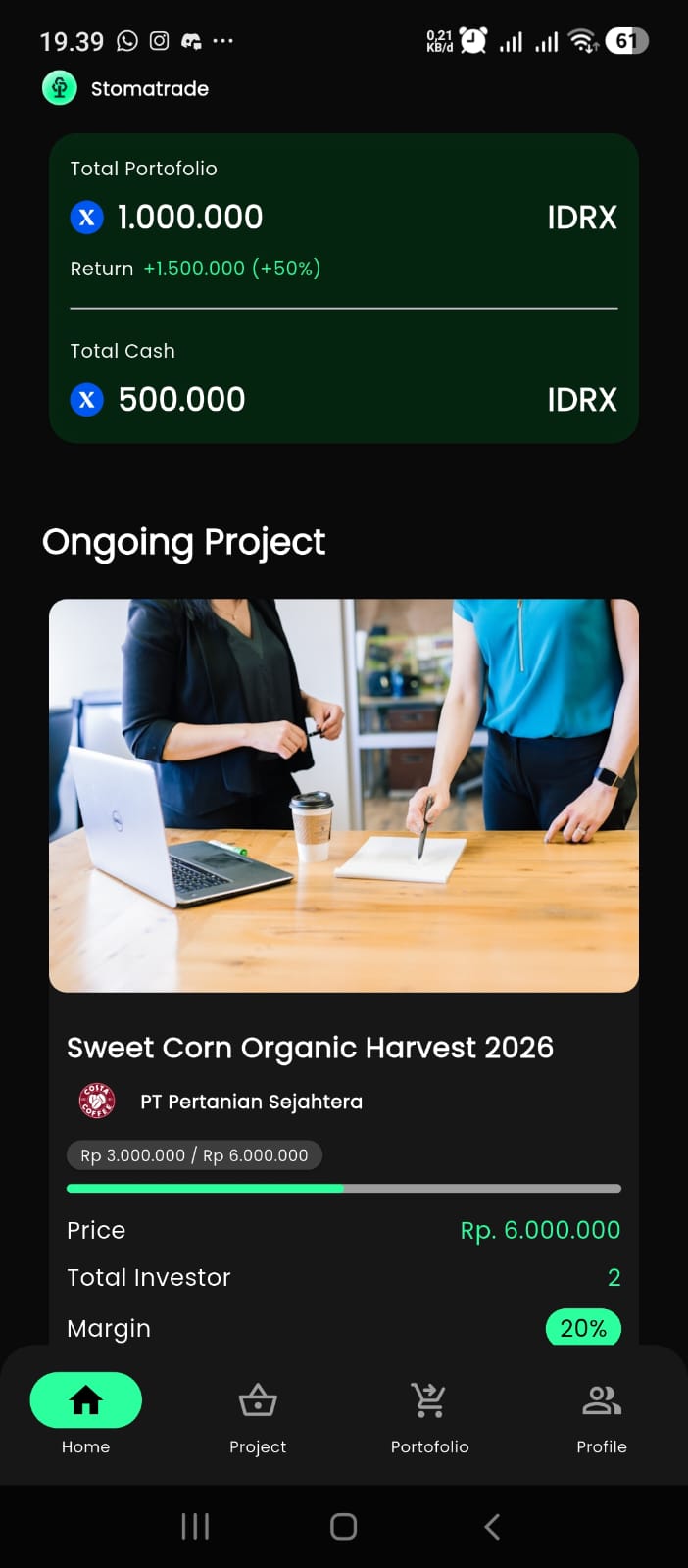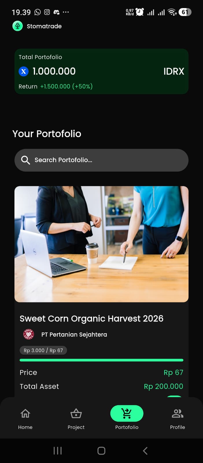 Stomatrade provides short term financing backed by harvested crops as Real World Assets, enabling farmers and aggregators to access fast liquidity within days. Through the platform, aggregators can apply for funding by using harvested crops as collateral, while investors participate by deploying stablecoins (IDRX) to finance verified agricultural projects.
